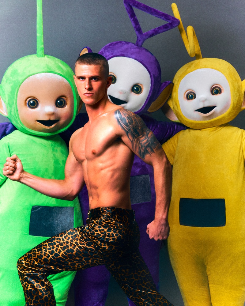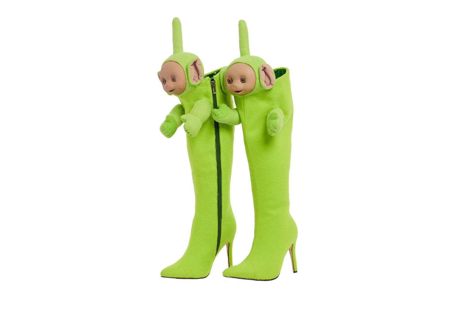British designer Christian Cowan has teamed with British television characters, the Teletubbies. The hit 90s program features four iconic characters with TVs embedded into their tummies and antennas atop their heads. There’s Tinky Winky, the purple leader with a triangle antenna, Dipsy, the green straight antenna character, the cheerfully yellow Laa-Laa with a curly antenna, and the little Po, who is red with a circle-topped antenna.