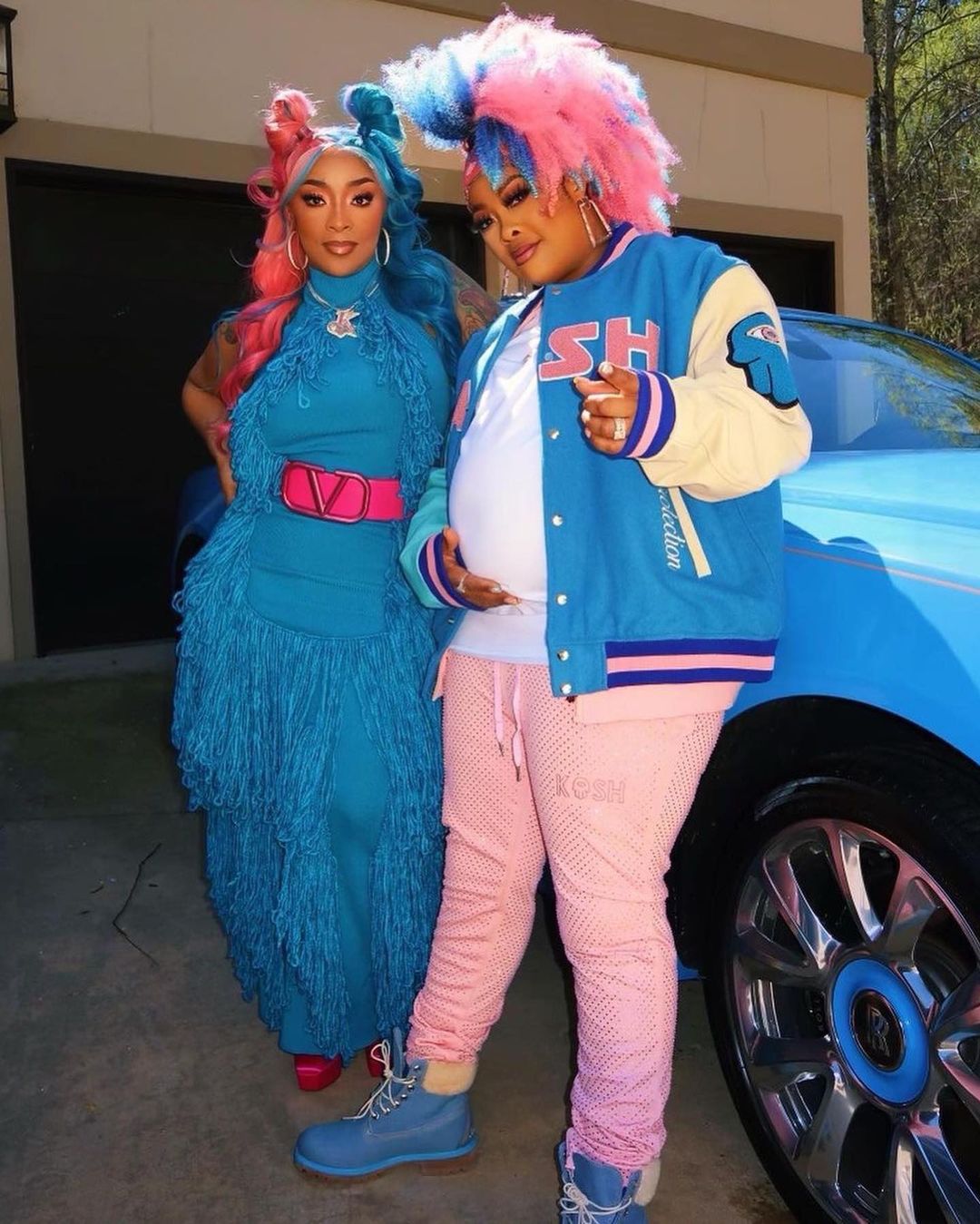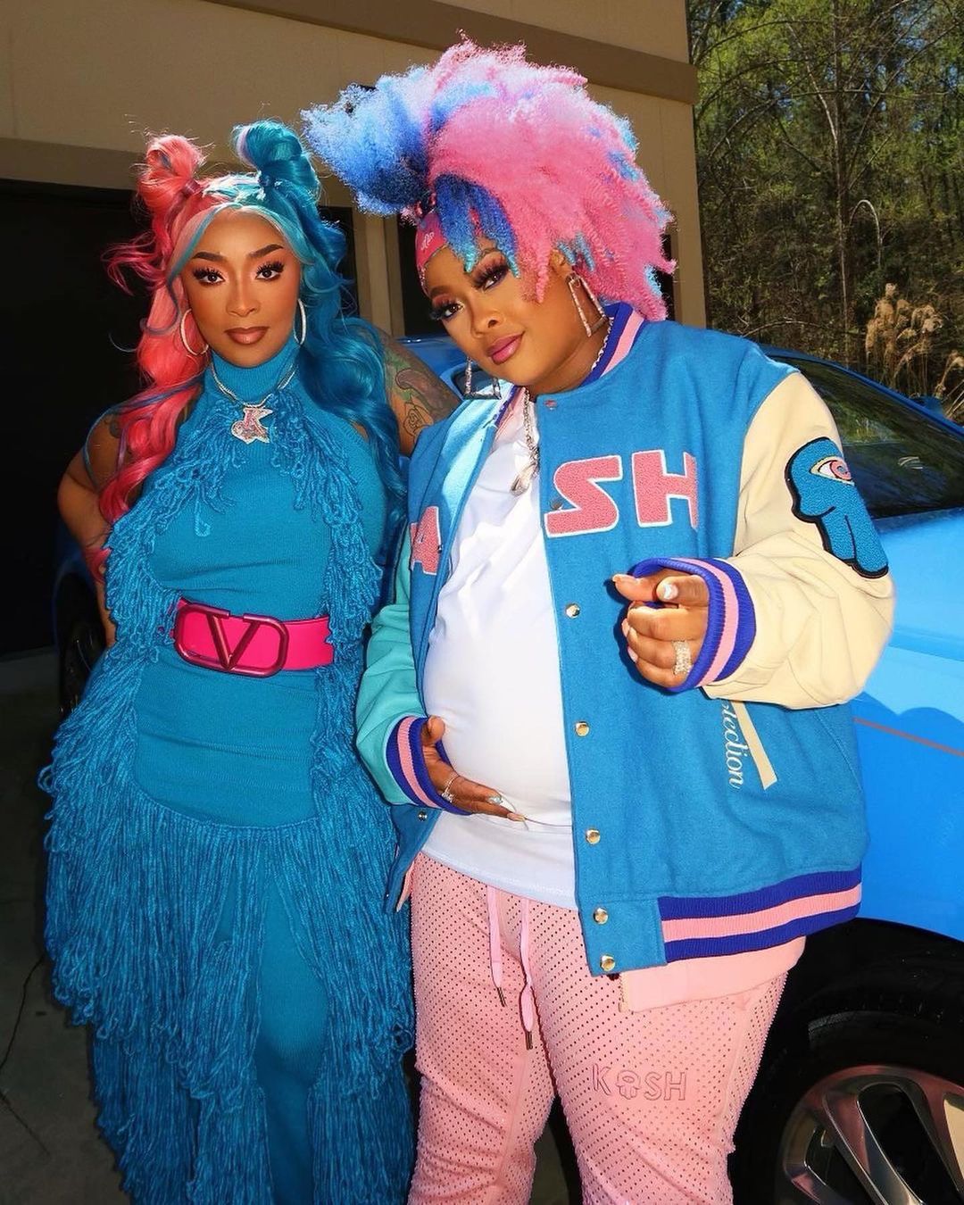 Both mothers-to-be went super extravagant with the blue and pink theme, rocking both colors from their hair down to their shoes.