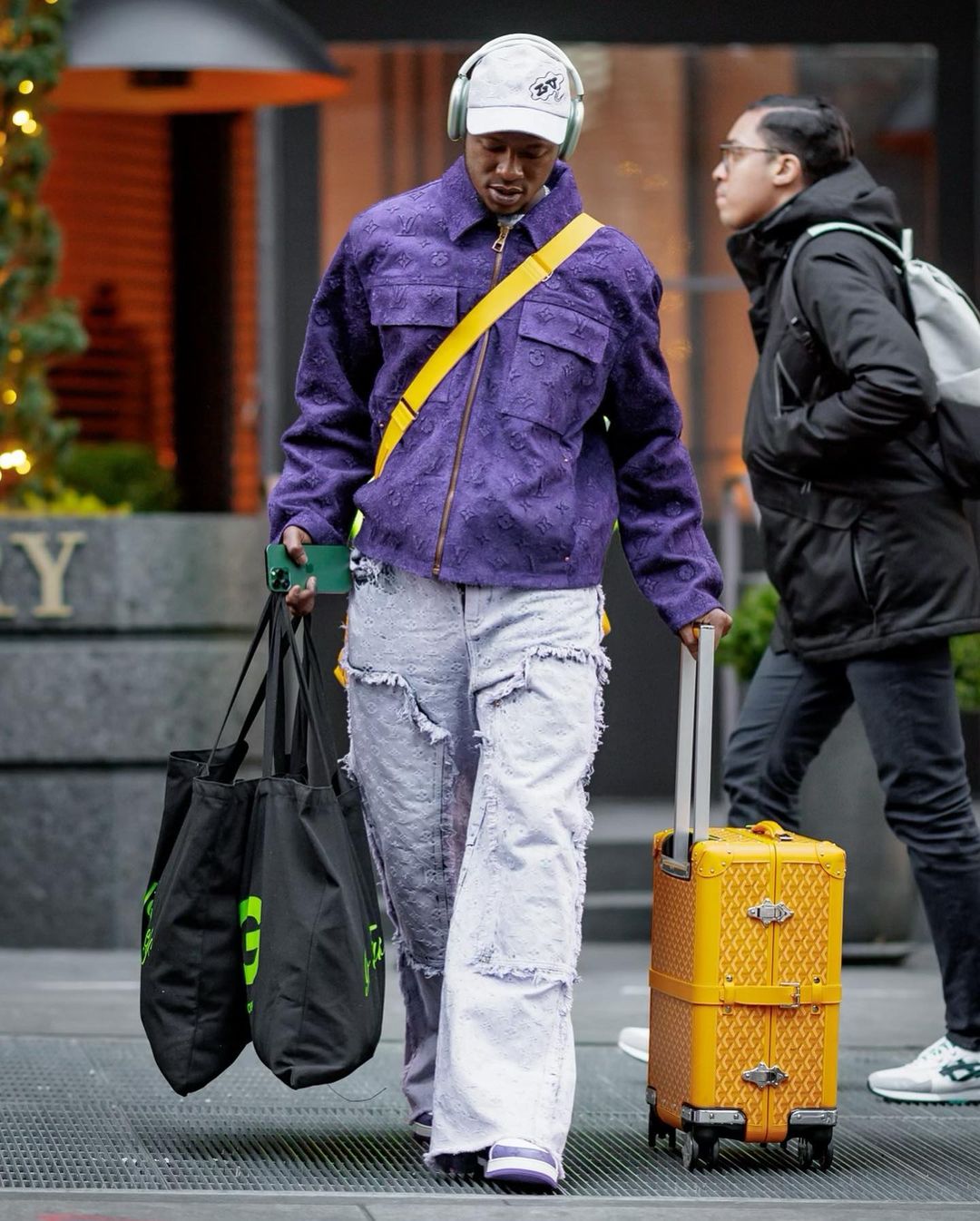 In early March, the jacket was first spotted on Charlotte Hornets shooting guard Terry Rozier, who styled it with a Louis Vuitton hat, the brand’s wide-fringed carpenter trousers, the LV skate trainers, and Goyard luggage.