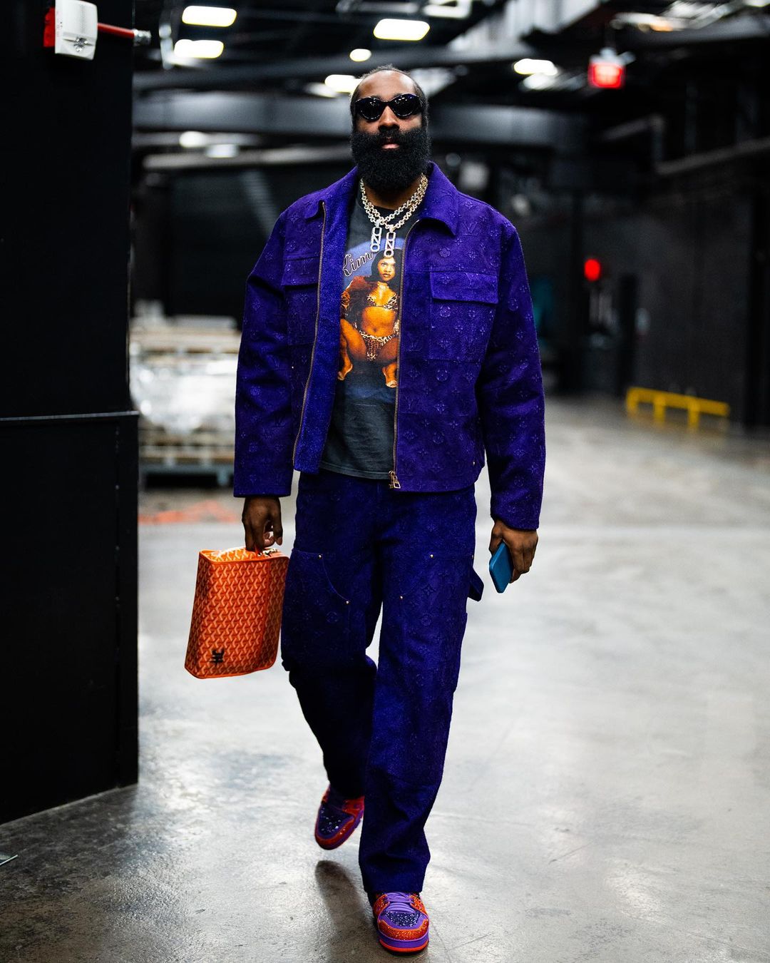 James Harden is the latest athlete to dawn the trendy jacket, but the first to style it with the jacket’s matching embossed trousers. Like his peers, he also wore LV skates.