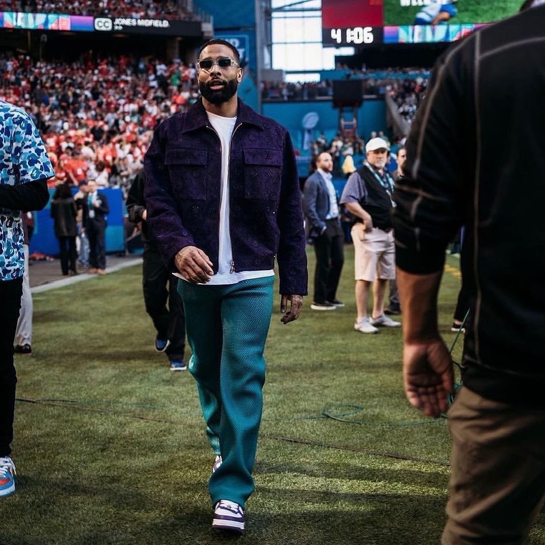 Shortly after, free-agent Odell Beckham Jr. was spotted on the field in the jacket with teal trousers and the same purple LV skate sneakers Rozier wore.