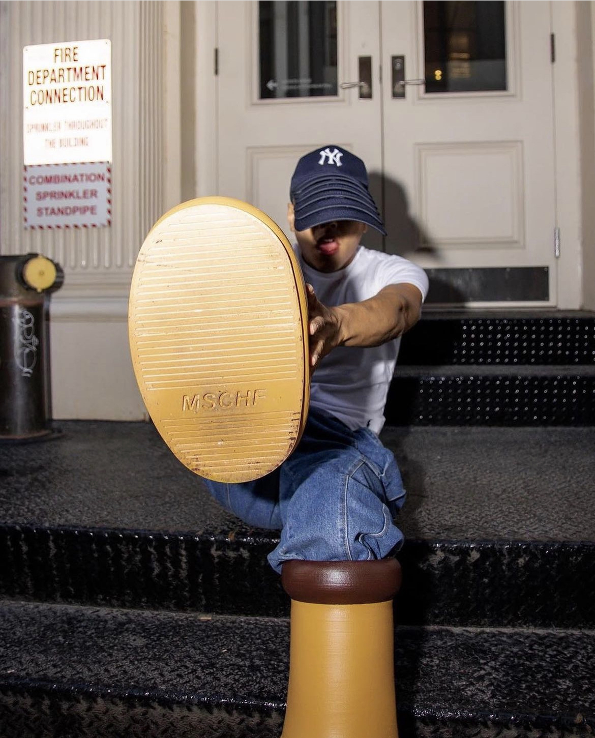 A Designer named Ari, who goes by the IG handle @Pleaselookatmyas offered his interpretation of how a Mschf and Timberland collaboration would look. He explained, “my friend Danny Kabouni 3D printed a pair of Mschf boots, and the other day we try to spray paint them into a Timberland color wave and look what happened,” said Ari.
