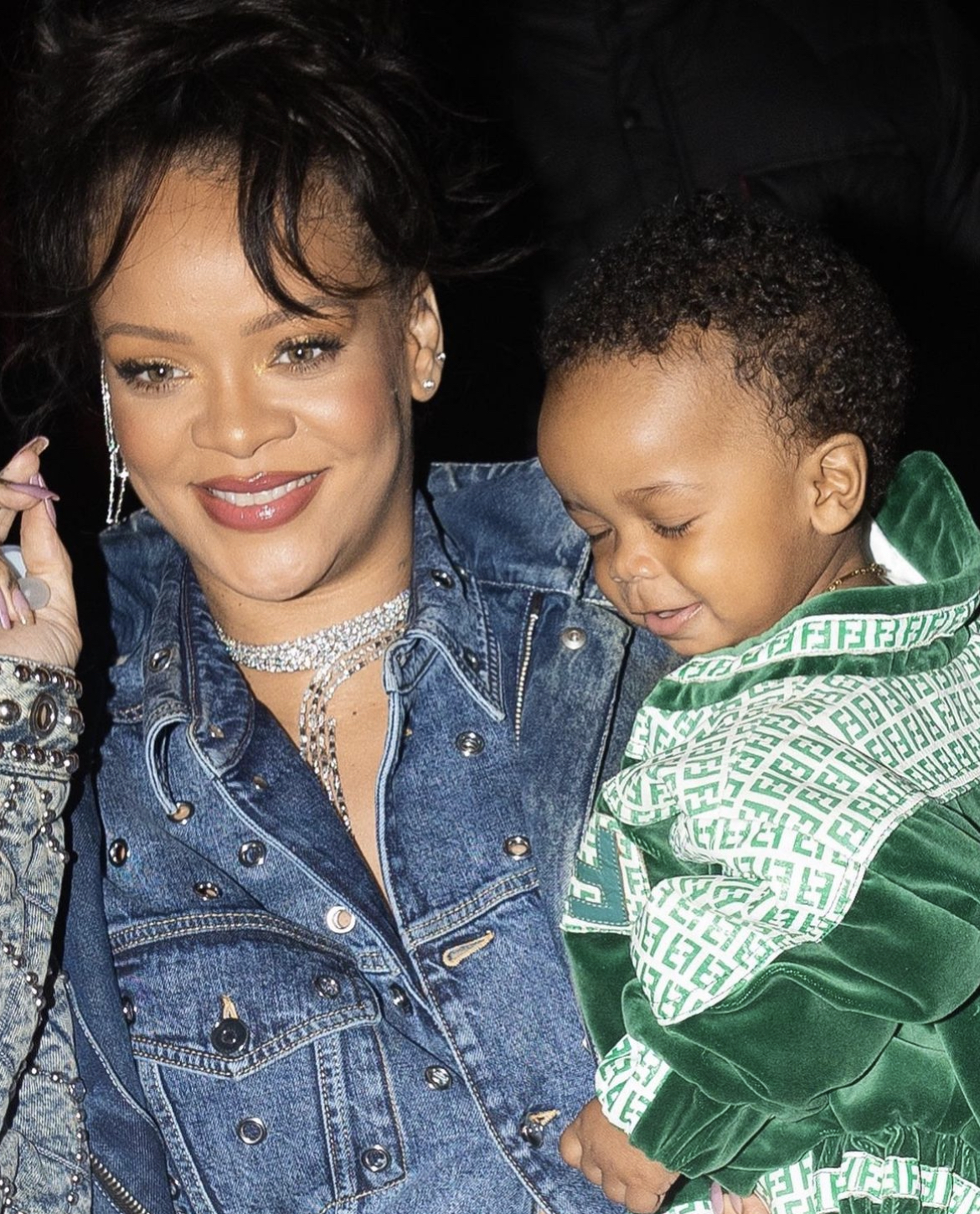Resembling A$AP Rocky and Rihanna’s father, RiRi’s son looked so fresh in a green monogram Dapper Dan Harlem X Fendi jacket that had rich velvet detailing and she style his look with denim jeans and adorable Gucci Chelsea boots that had their signature gold hardware.