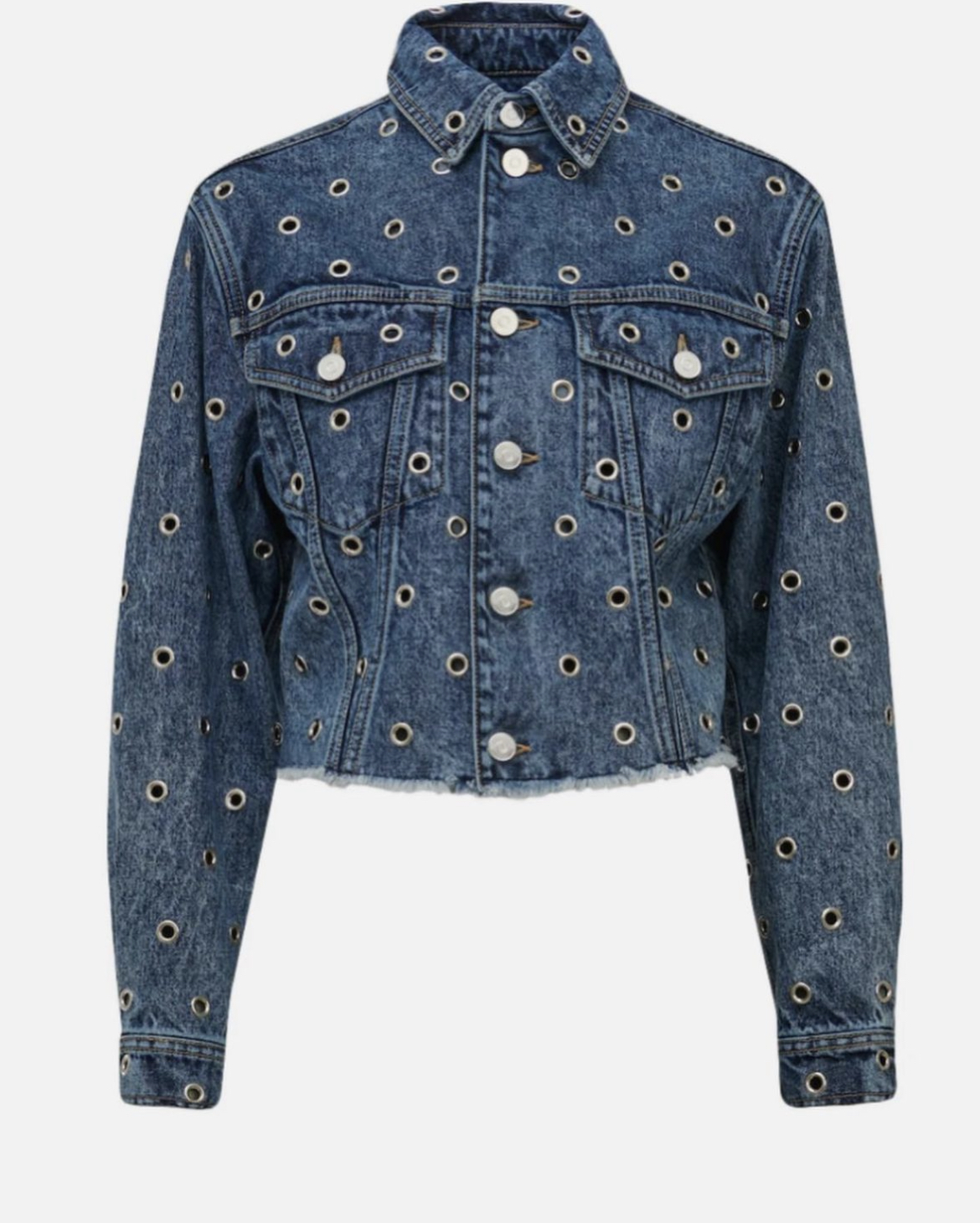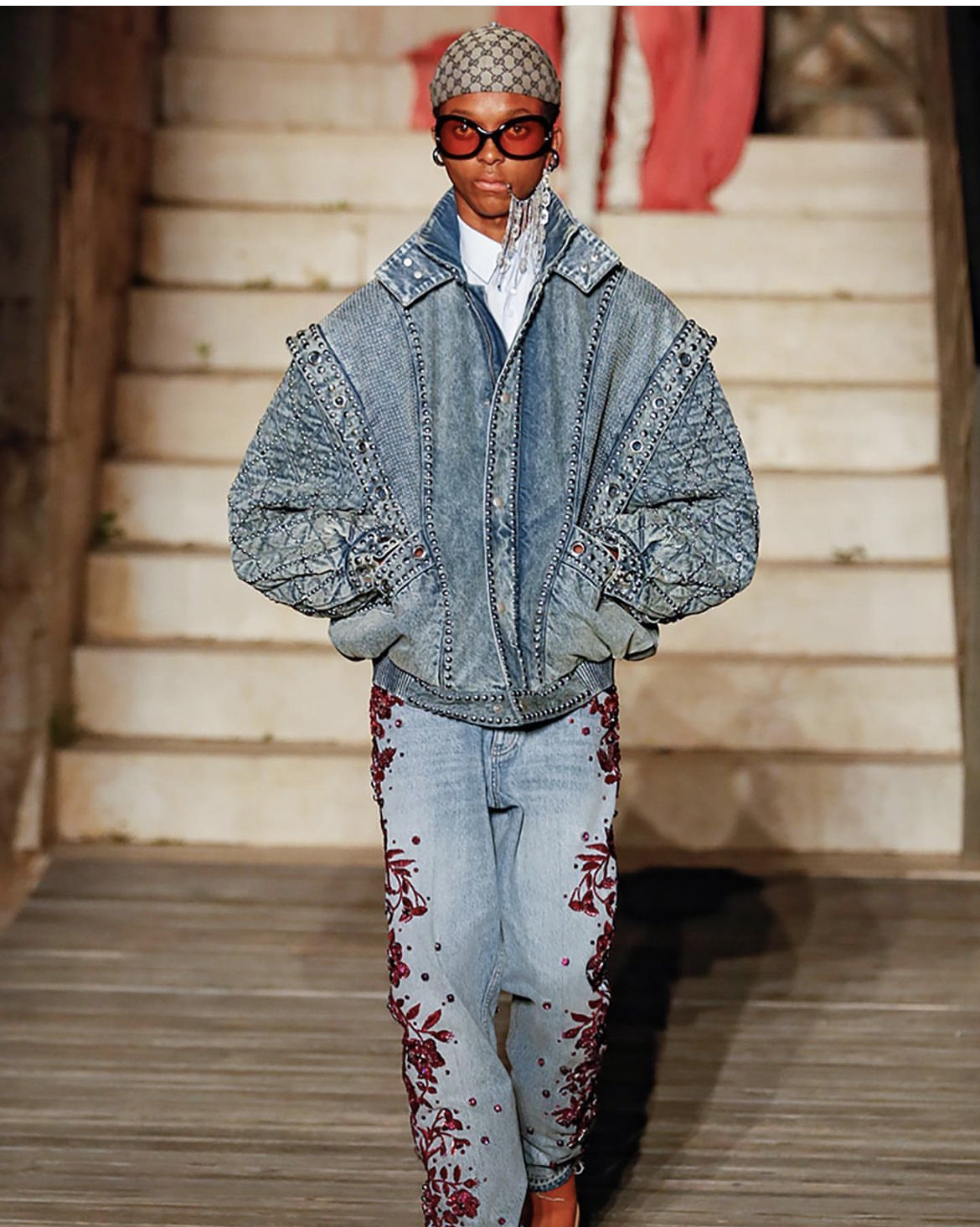 RiRi went for a denim-on-denim look which is so on trend and layered a Gucci Resort ’23 denim jacket on top of a $2290 studded Maison Alaia eyelet denim jacket and paired with a Courreges mini skirt.