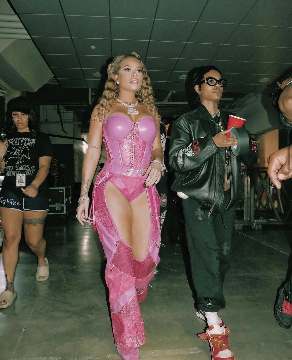 Latto stood out in her bright pink House of JMC custom leather cowgirl outfit, styled by Todd White. With the use of various pink snakeskin fabrics, Latto’s look included a formfitting corset and pink leather chaps that revealed her entire bum backside