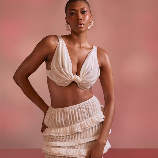 Spring/Summer 2023 has an appreciation for exotic pleating and iridescent tones. Wide-leg-yacht-party-friendly trousers are folded neatly at the waistband, while tiered midi skirts feature pleats atop ruffles. Elsewhere in the collection, asymmetric details cover the backs of night-out dresses, and the brand’s signature sculptural shapes are ever-present.