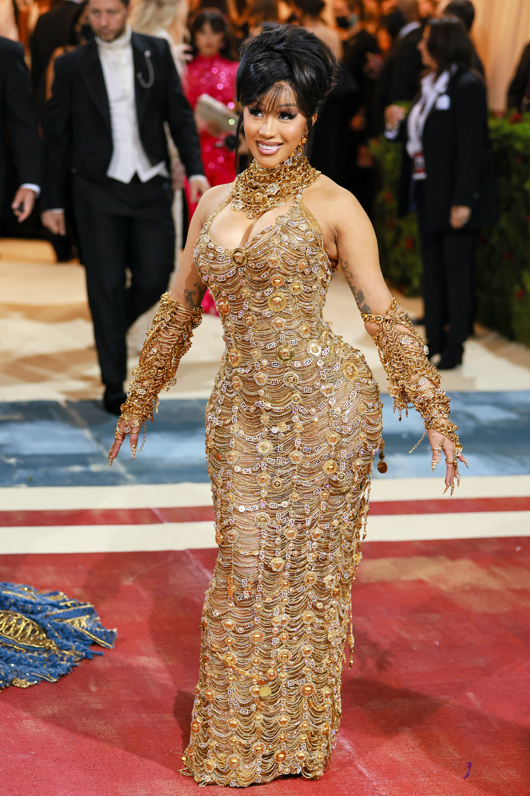 Rapstress Cardi B took the “Gilded” call seriously, and sizzled on the maroon carpet in a golden Versace gown equipped with copious chains and Medusa medallions. Gold nails and layered chains completed her look.