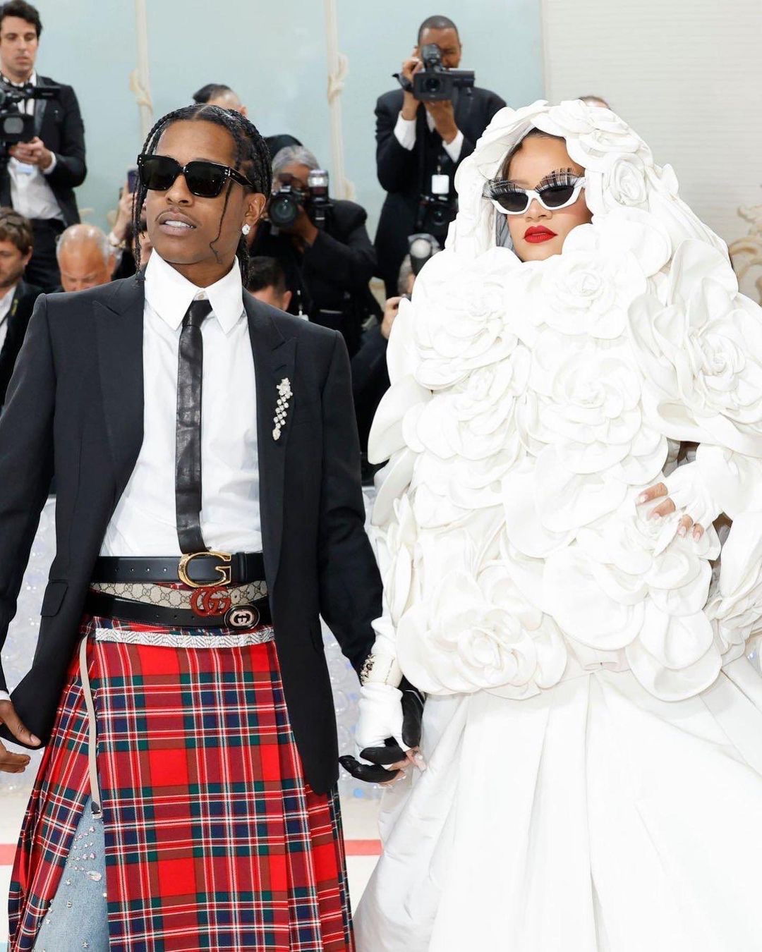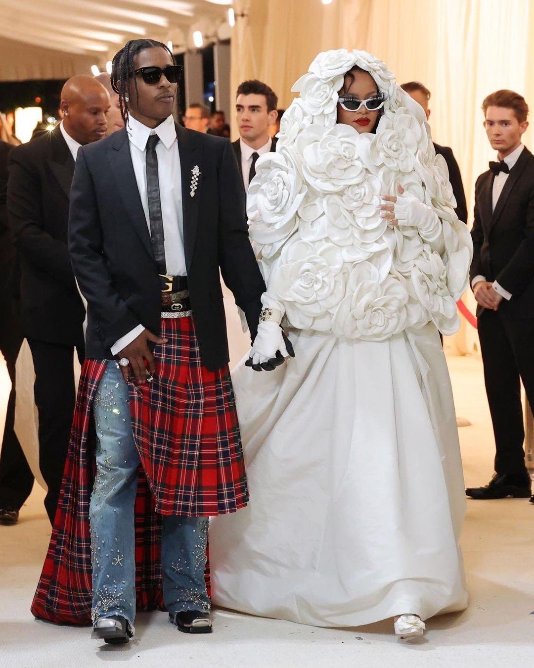 Walking hand in hand as they strutted from the Met Gala tents, A$AP Rocky led the way in a full Gucci ensemble that included a formal look up-top and an innovative one down-below.