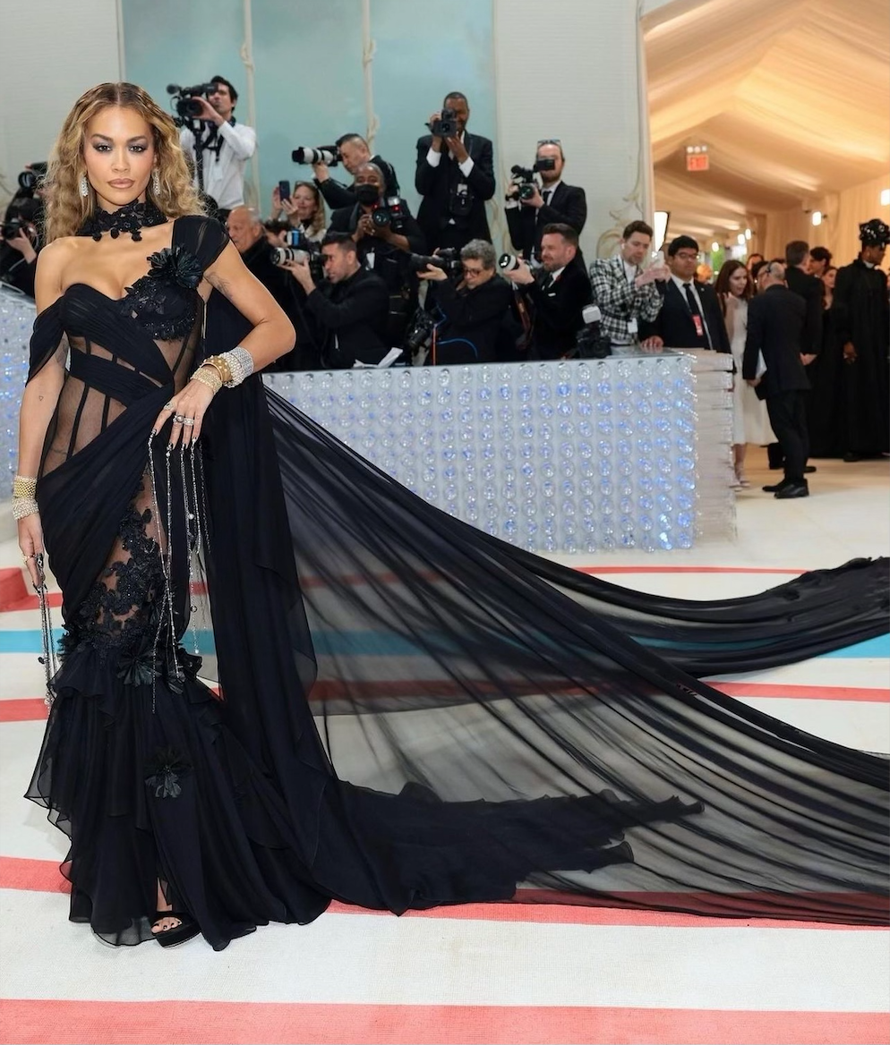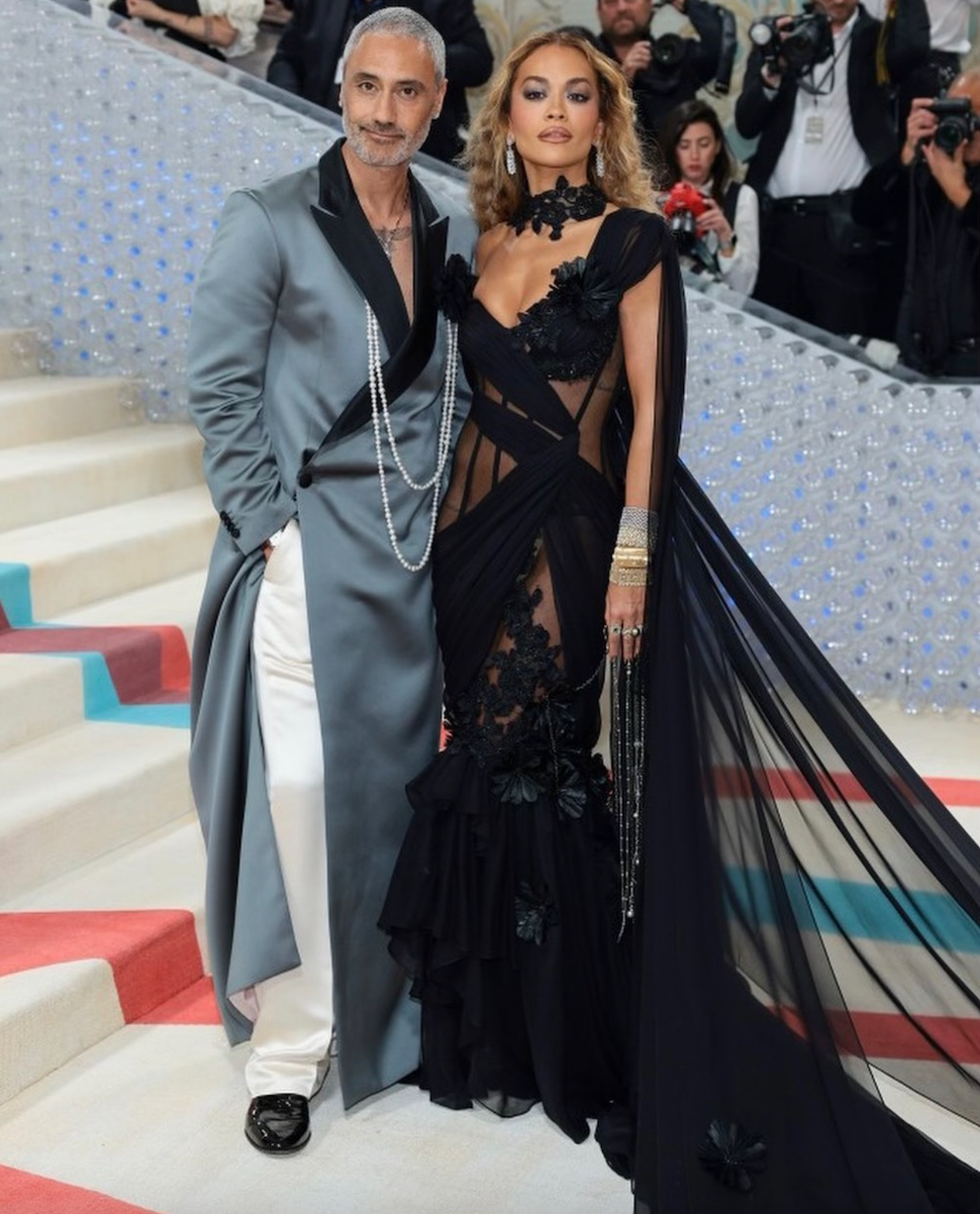Rita showed up to the Met Gala alongside husband Taika Waititi wearing a black sheer 3D floral Prabal Gurung gown, however her nails was the talk of the night. Nail artist, Naomi Yasuda designed a black stiletto nail set, with full length beaded chain necklaces on every finger. Rita’s nail necklaces were glued to her mani. She paid tribute to the theme: “Karl Lagerfeld: A Line of Beauty,” by adding a little Chanel logo that can be seen on her index finger, paying homage to Lagerfeld’s long-held position as the brand’s creative director. Now how exactly did she sit down to eat or use the restroom? Not sure, but at least she was stylish.