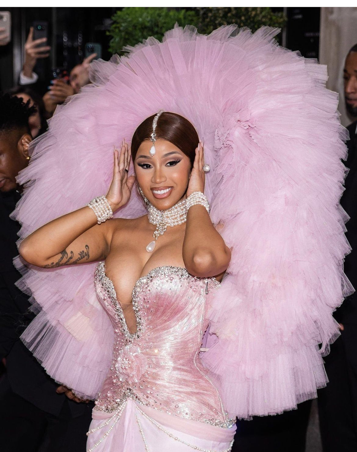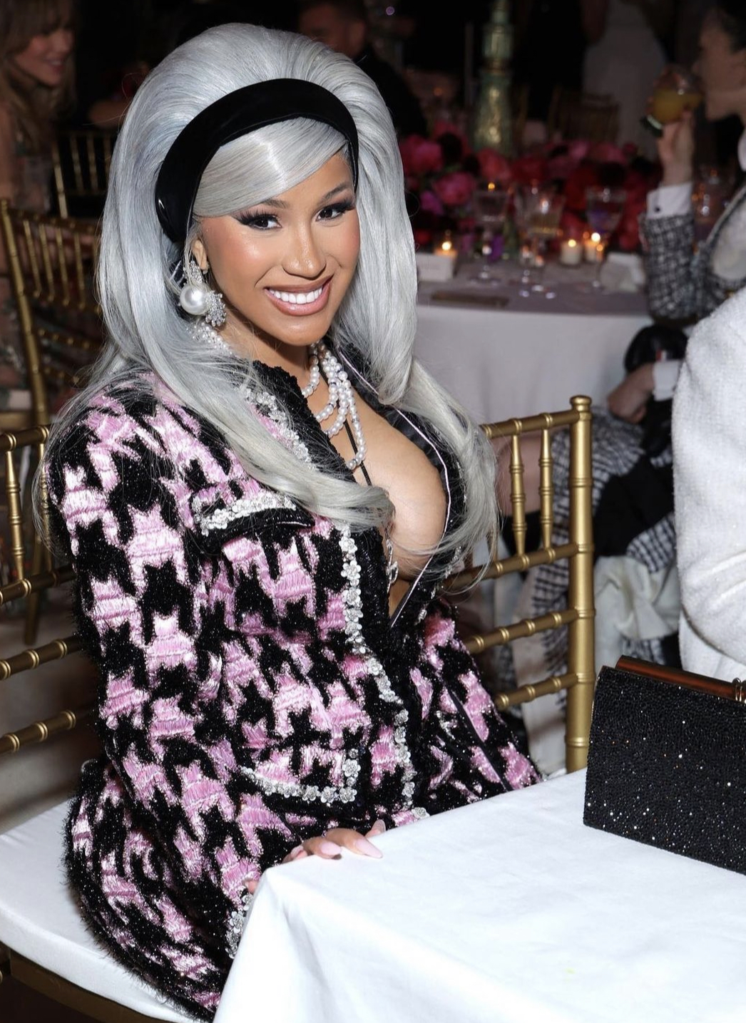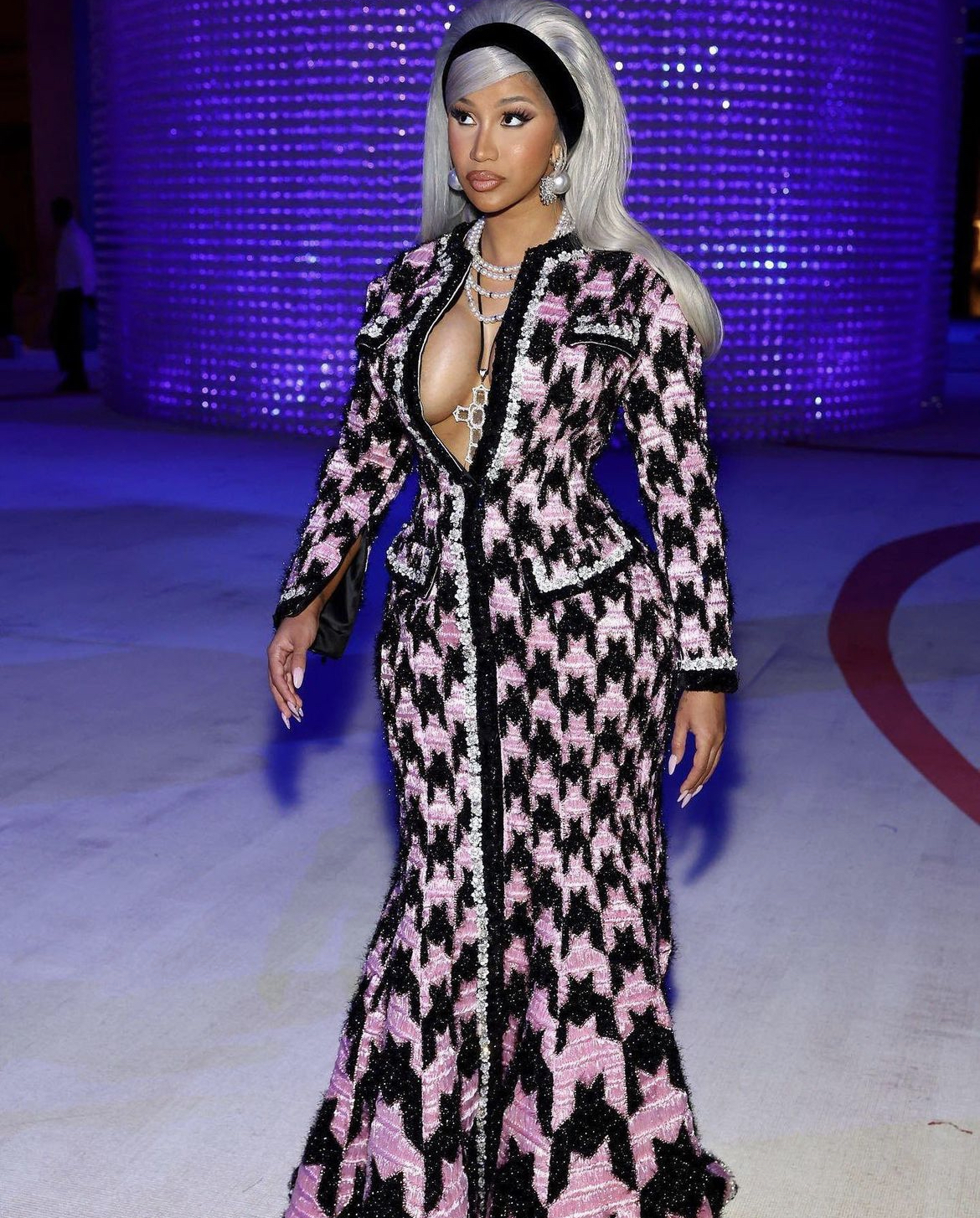 Transitioning into a third look once she made it inside the venue, Cardi B wore a pink and black Richard Quinn tweed gown to honor the legendary fashion icon. Her ensemble was such a game-changer that it totally blew us away. We love how she accessorized with pearls necklaces and earrings and Quinn’s design undoubtedly looked like something Karl himself would have curated during his time at Chanel.
