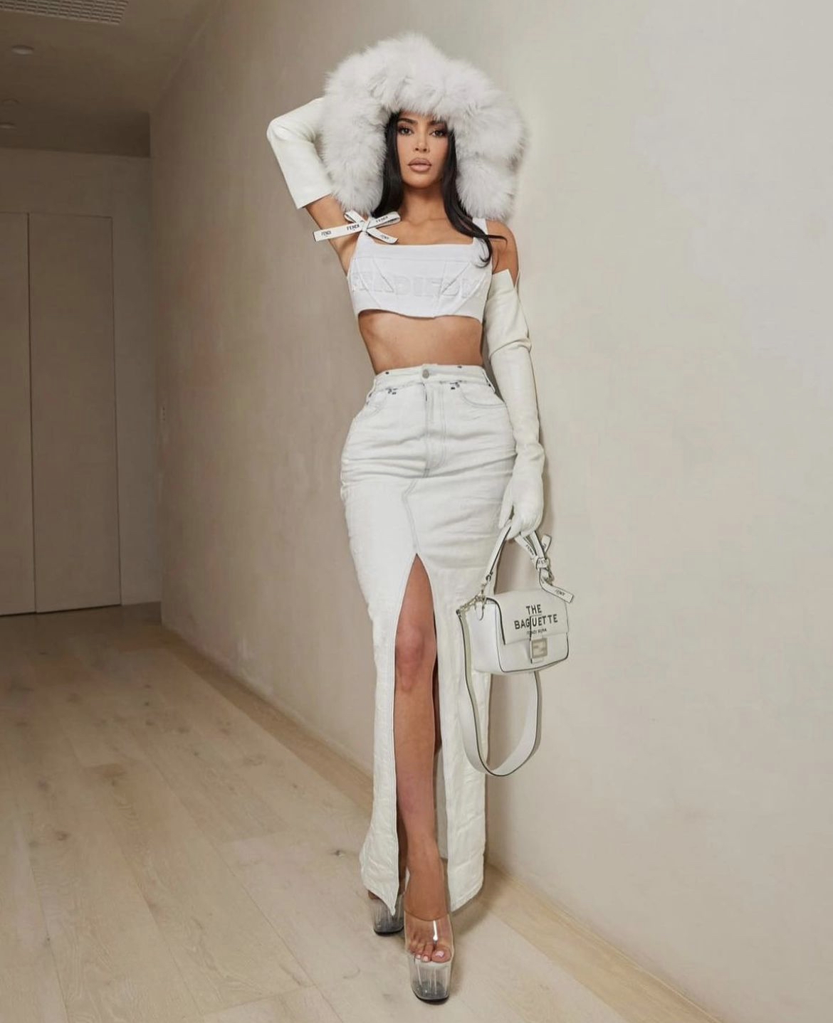 Along with her strikingly beautiful statement hat, Kim paired her look with a white cropped corset that she styled with a light-blue denim skirt which was identical to what we saw on the runway previously. She chose to accessorized with white leather gloves and clear platform mules that showed her well-toned legs through the high-slit of her denim skirt.