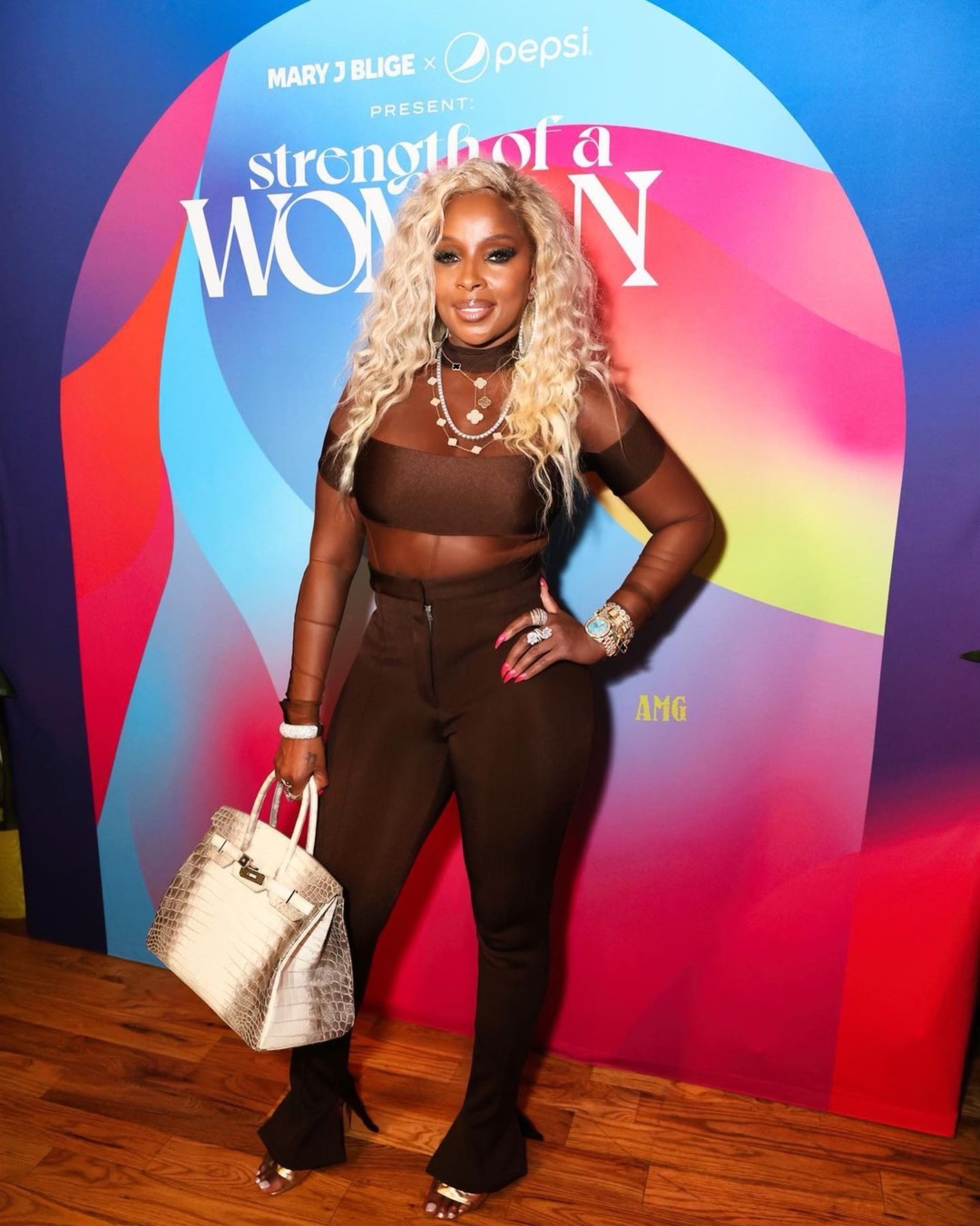 Both Claire and Mary looked absolutely stunning with Blige opting for a full chocolate brown Mugler ensemble that included a sheer bodysuit with form-fitting flare pants that had cutouts at the waist. You know that anything that involves Mugler, will certainly have sex-appeal and that’s definitely what the songstress was giving. Blige chose to accessorize with a nude Himalayan Hermes Birkin bag and Van Cleef & Arpels jewelry.