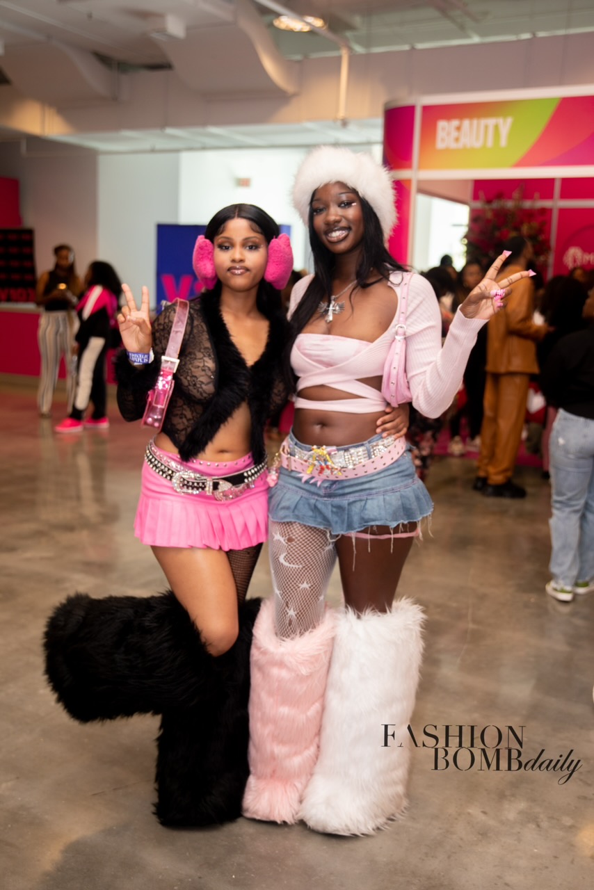 Bombshells Amanda Dia (@Yourfavthickums,) and Aliyah Core (@aliyahsinterlude) looked very animated in their mini pleated skirts that they layered with studded belts which felt very 90’s. Their oversize fur boots were quite the statement to say the least and we love how they incorporated pink hues into their ensemble.