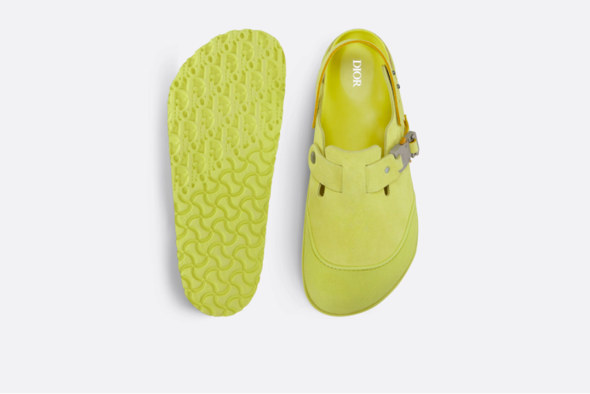 The classic Birkenstock orthopedic outsole is decorated with the Dior Oblique monogram and sits below a pastel yellow nubuck calfskin upper with a reinforced utility toe. The adjustable back strap offers functionality and fashion, while the aluminum Dior-branded buckle finishes the German-made sandal.