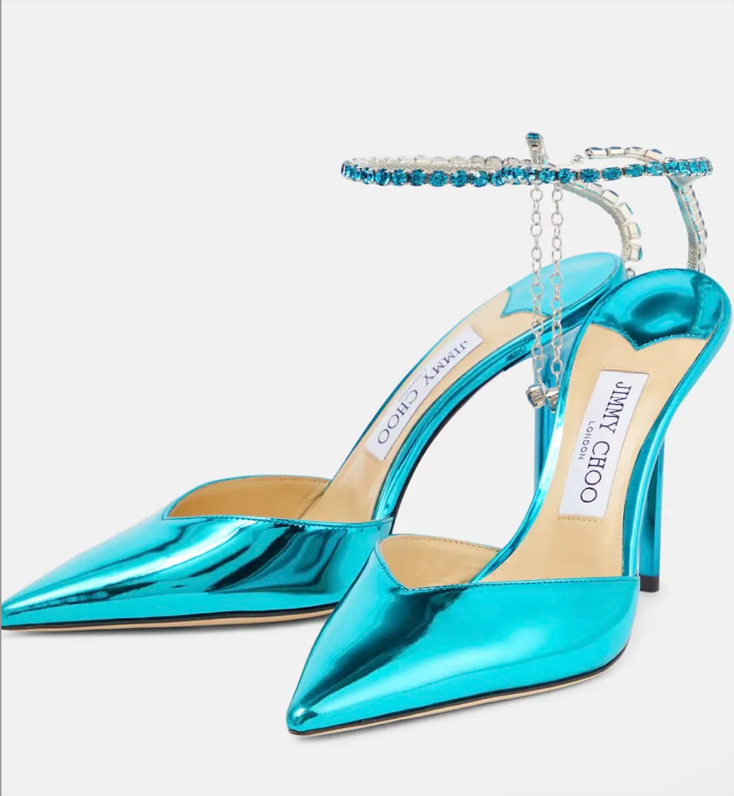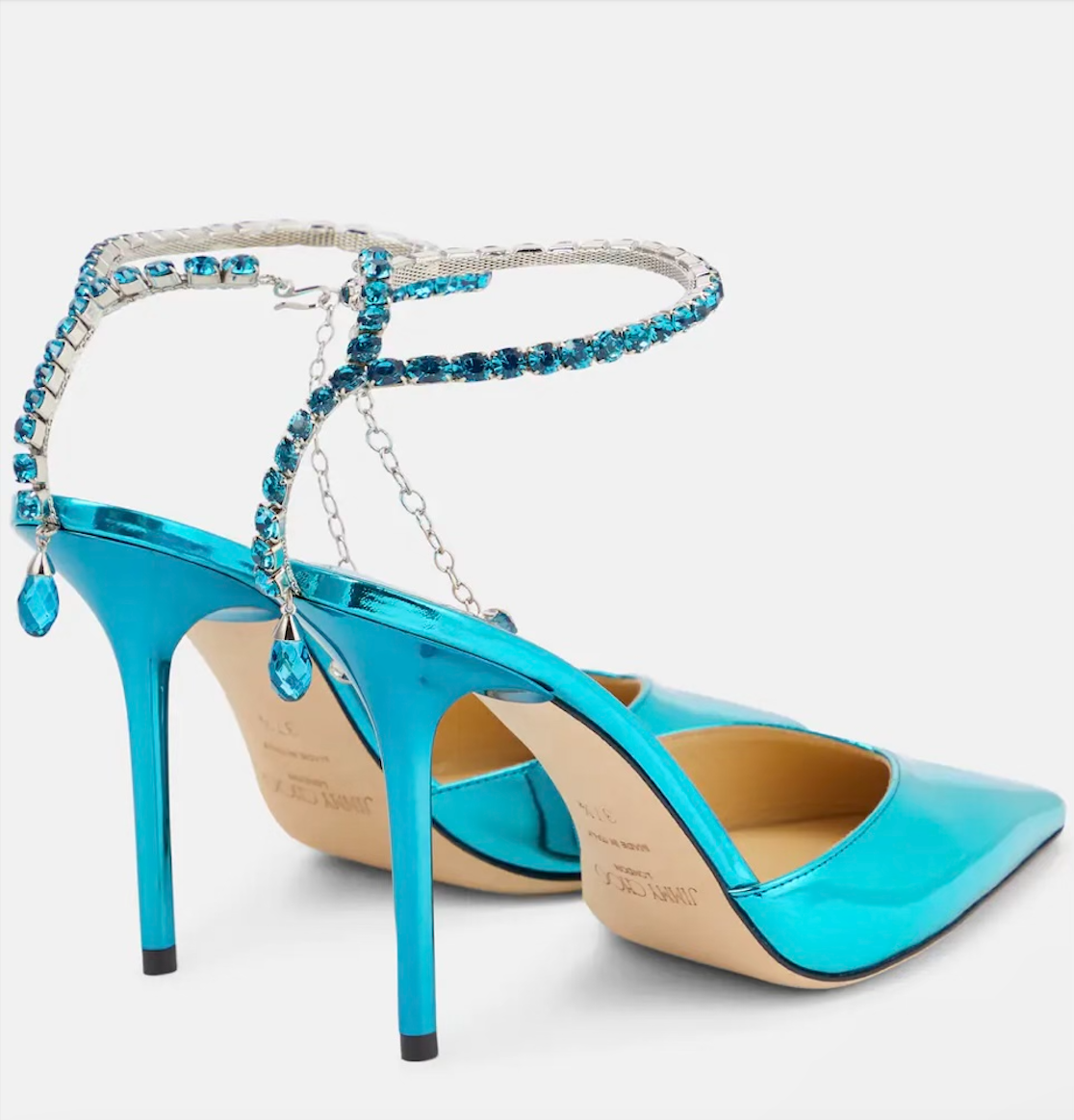 Created with a shiny metallic leather and pointed toe, the star of the show is the crystal-embellished ankle straps that has the most perfect aqua jewels.