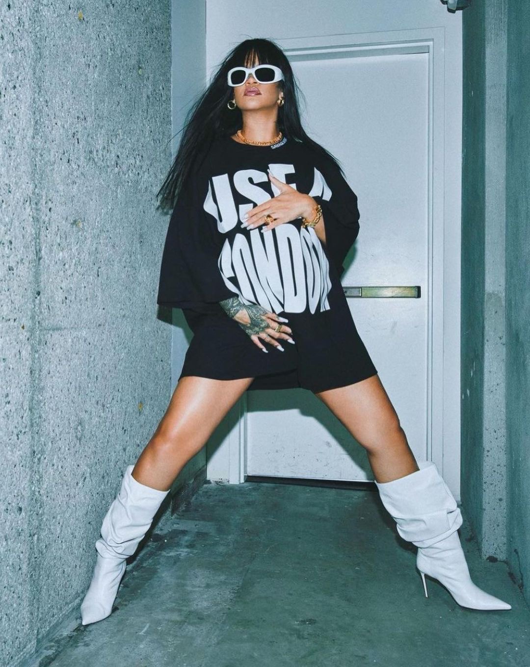Despite the shirt being an oldie but goodie, the “Use a Condom” oversized graphic tee is still available on Savage X Fenty website and retails for $69.95. It’s 100% cotton and has a knit logo at the collar.