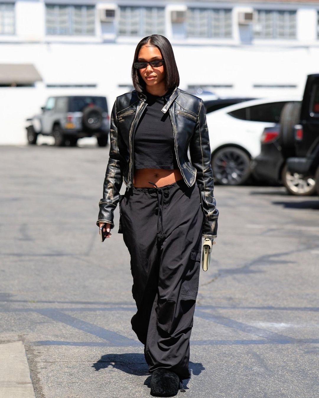 Harvey opted for a black Mimchik leather moto jacket that she paired with a $96 Eterne tee, and oversized Local European parachute jogger pants. She kept it comfy with her black Amina Muaddi slippers and accessorized with YSL shades and a nude Hermes clutch bag.