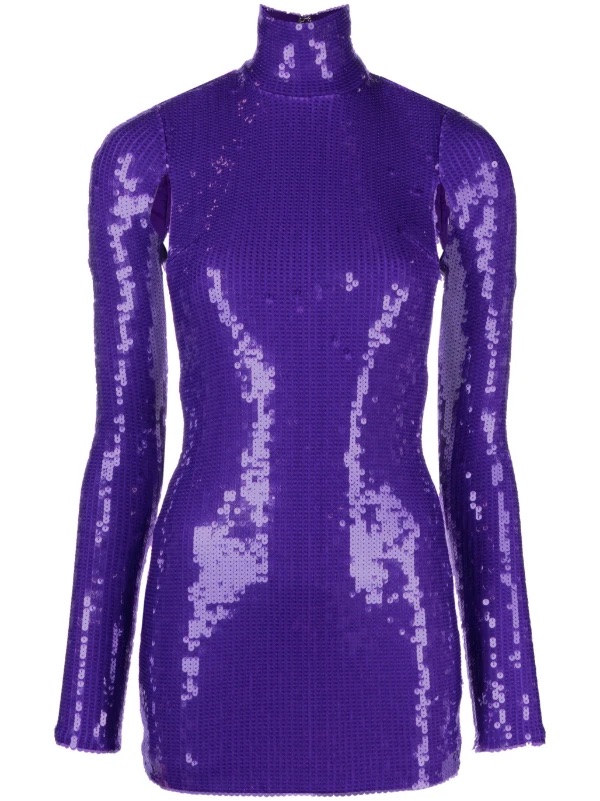 The violet sequin on this open back number is a staple material from LaQuan’s Spring Summer 2023 collection. Pairing the dress with a pair of Tom Ford pumps in highlighter green, a choice fashioned by stylist Scooter Styles, really drove the look home. We love the color combination!
