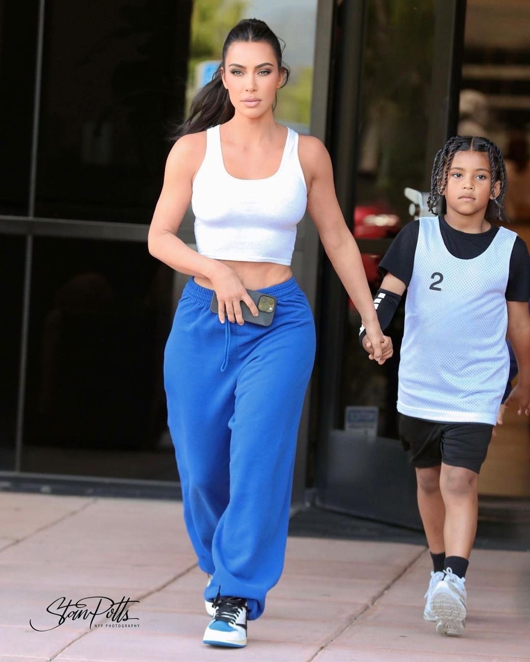 After just celebrating North West’s birthday, Kim Kardashian was spotted attending her oldest son Saint West basketball game in L.A. and she took the athleisure route and opted for a simple white crop tank and blue sweatpants.
