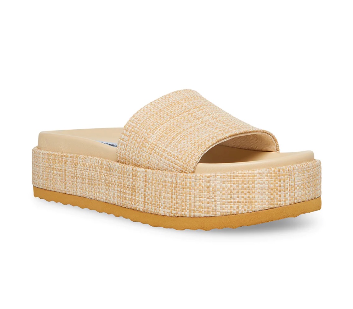 You can get the same look for less with Steve Madden’s Kasper slide sandals which are priced at $89.95 and comes in both black and natural. In addition, the sandal features a strap and platform in a tweed-texture fabric to go with the molded footbed.