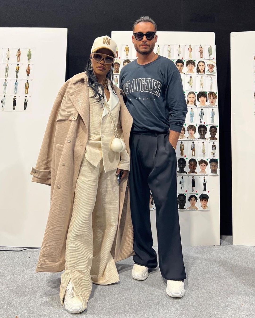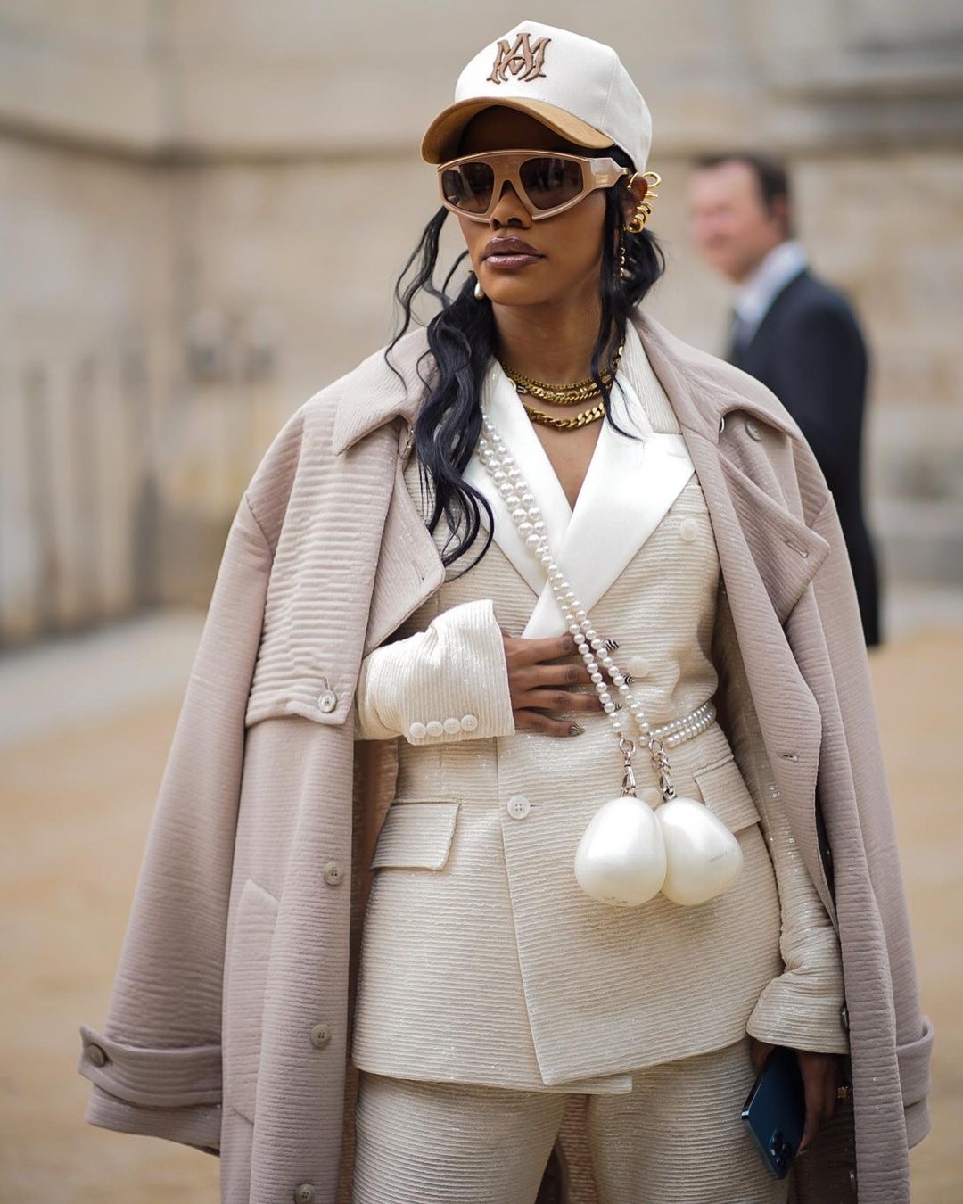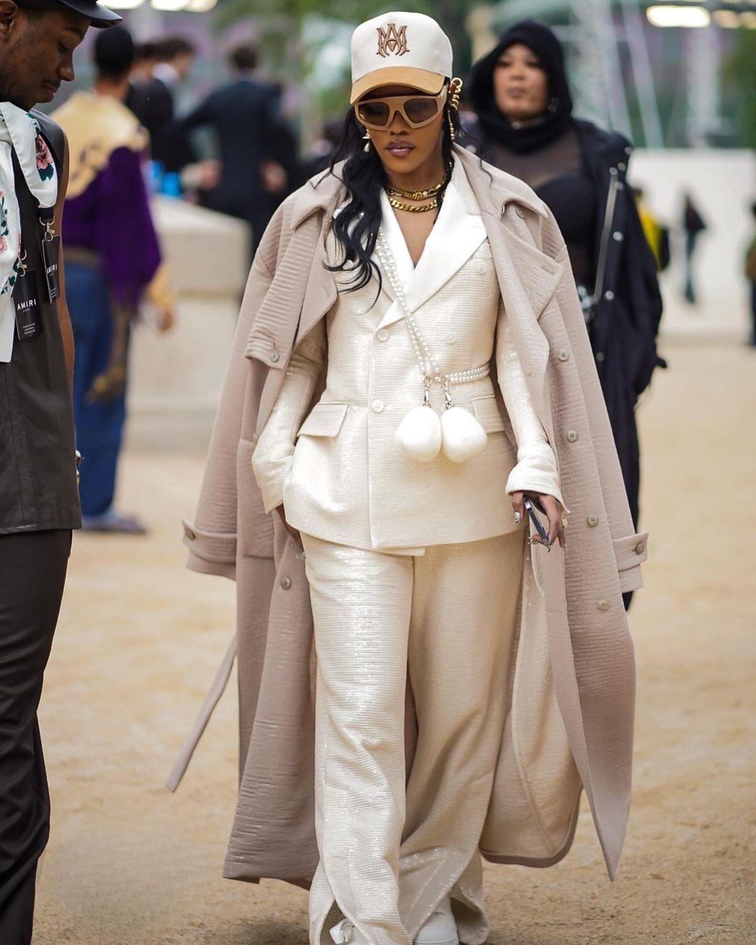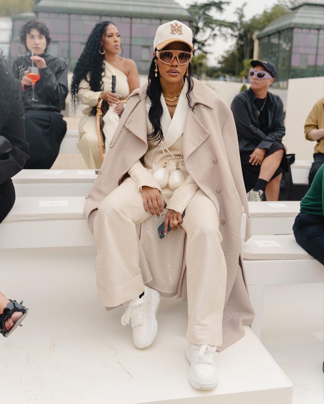 The “A Thousand and One” star shut down AMIRI’s Spring ’24 Paris runway show in cream double breasted AMIRI suit that was layered with a nude trench coat and paired with all white sneakers.