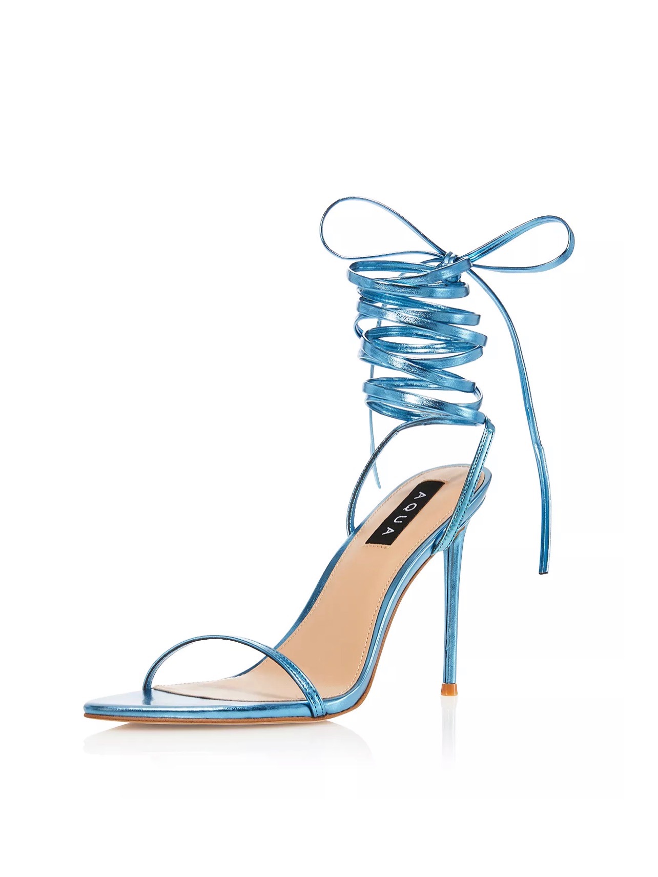 Available in the color black, blue metallic, white, and gold these leather sandal heels are affordable and stylish. Standing at 4-inches, these sandals fit true to size with an open pointed toe. Designed with a leather upper lining and sole, these sandals come with a wraparound strap for comfort and style.