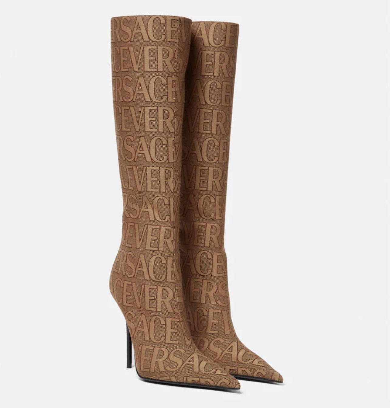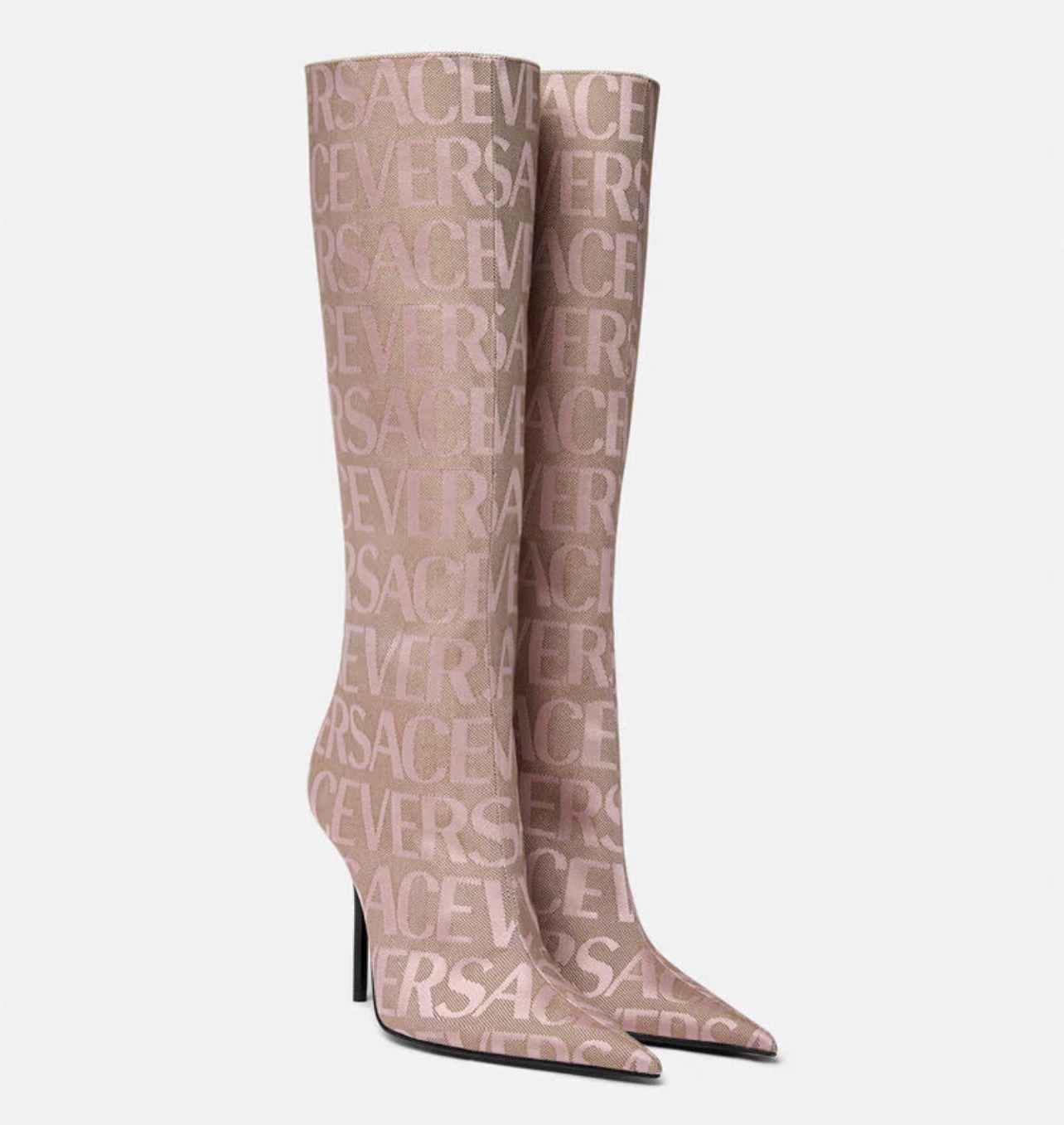 For a splurge of $1,295 , these knee-high boots are available in two colors, pink and brown. With the Versace logo all over the boot as the main design, these must-have boots were crafted from a Versace allover jacquard canvas with leather trims.