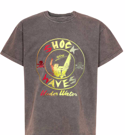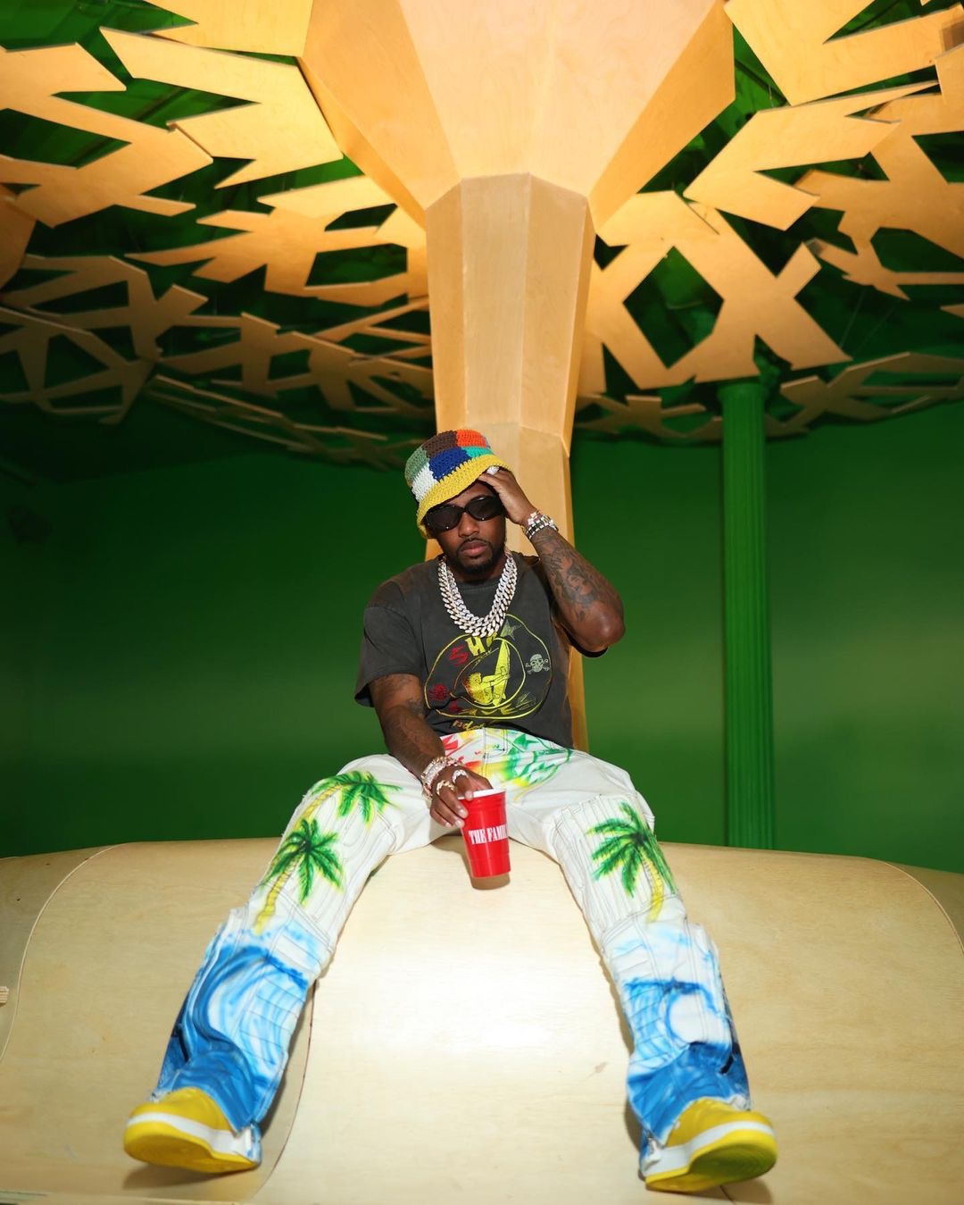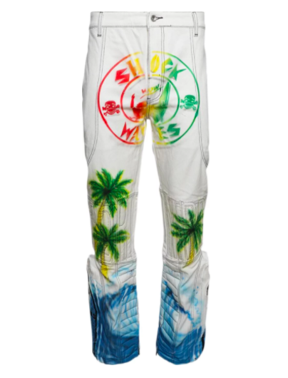 These jeans fuse street and beach with a cool white denim canvas decorated with green and yellow palm trees, bomb blue waves, and the Shock Waves logo vibrantly printed in red, yellow, and green. Fab styled his summery jeans with a Shock Waves t-shirt, also by the brand, Kleechi black titan sunglasses, and Nike’s Yellow Jewel Air Force 1 Lows.