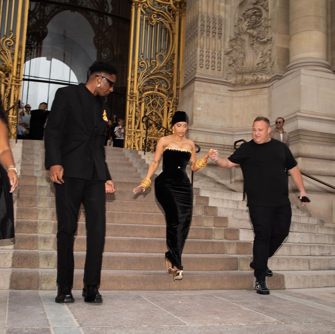 Stylist Kollin Carter who’s been responsible and the mastermind behind some of Cardi B’s most impressive looks was right next to the Rapper in an all black suit with a gold Schiaparelli pin as they departed from the show.