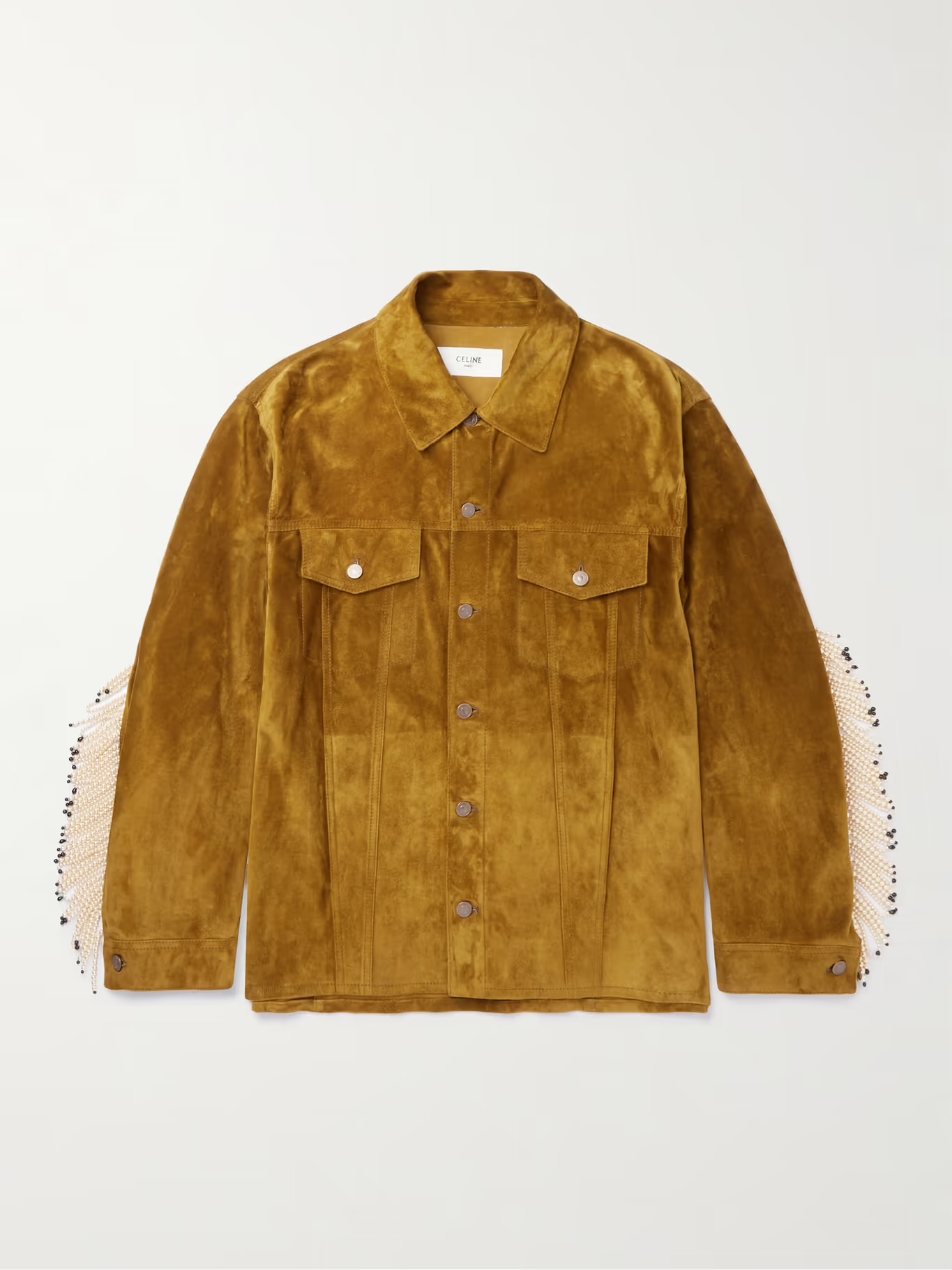 Get the look: $8,200 Celine Faux Pearl-Embellished Fringed Brushed-Suede Trucker Jacket