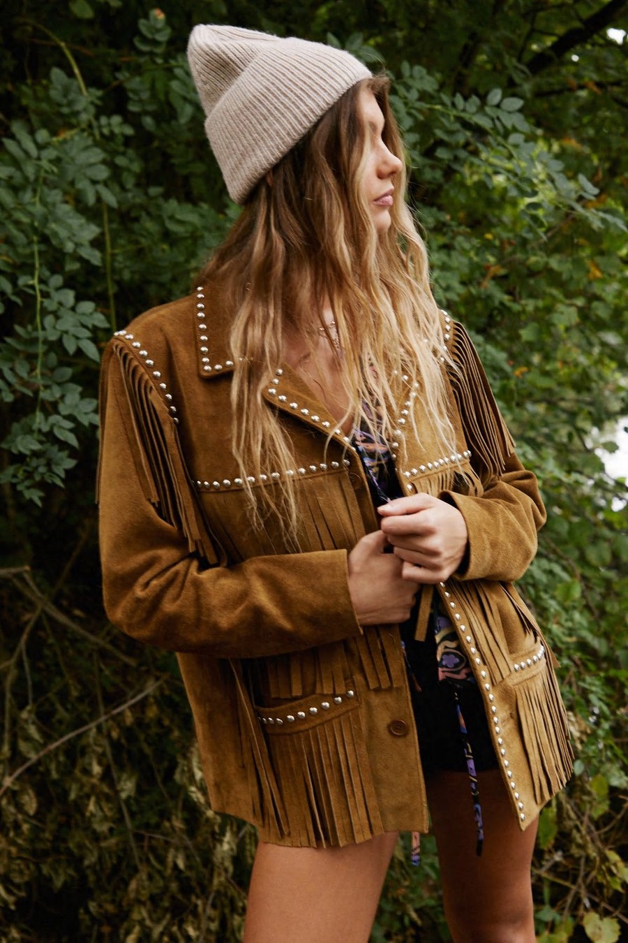 Similar style: $588 Nasty Gal Real Suede Studded Fringe Jacket