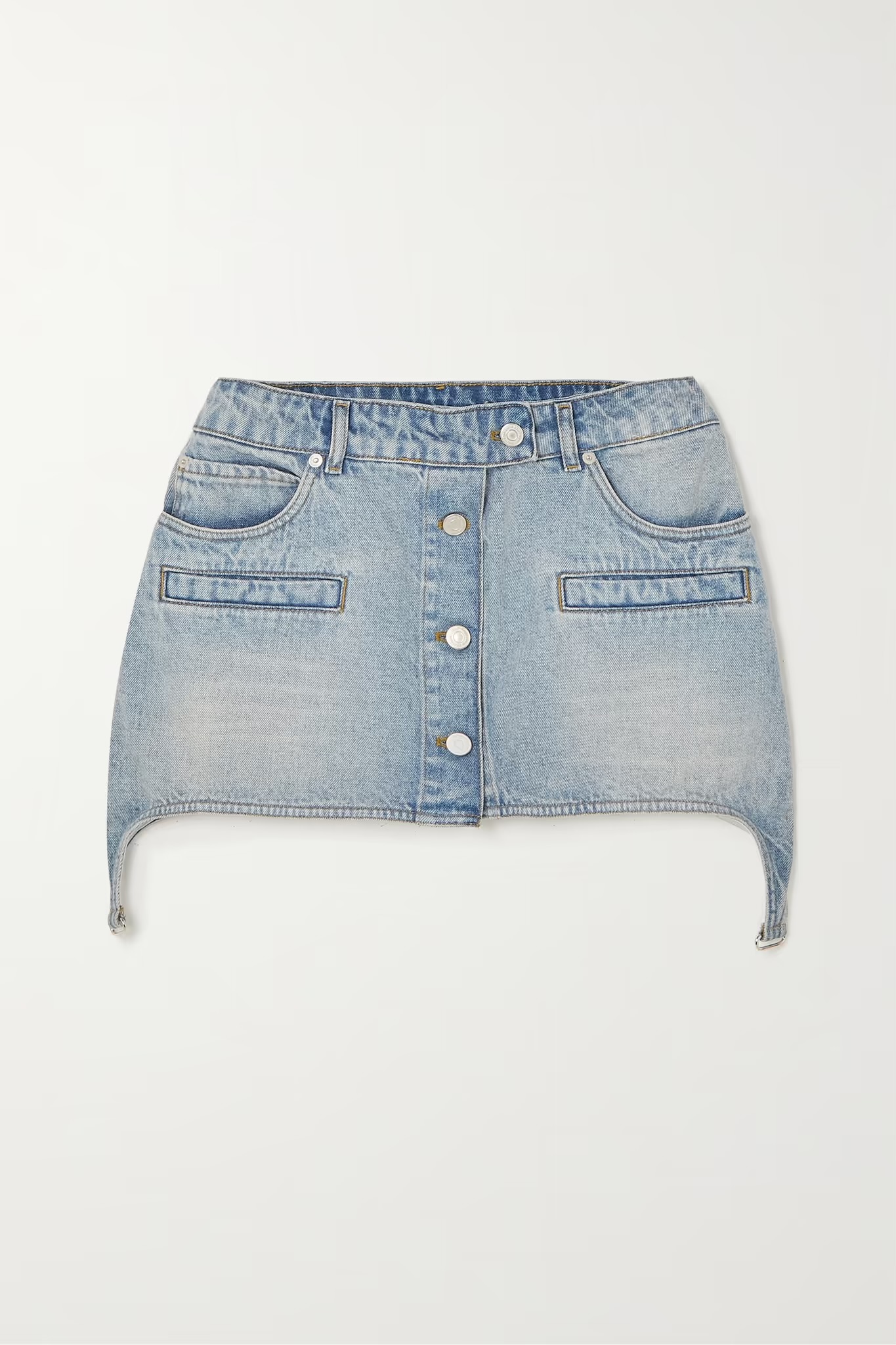Get the look: $600 $330 Courreges Buckle-embellished embroidered denim mini skirt
