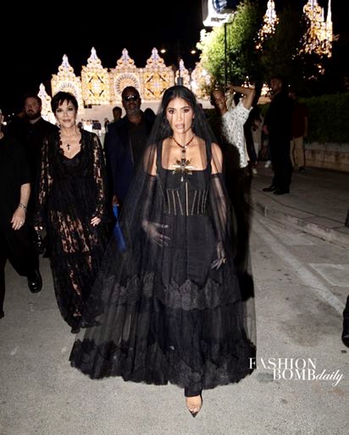 Following Kim’s first show-stopping Dolce & Gabbana look, she stepped out Sunday evening in a full gothic look that was dramatized with a long black sheer veil and gloves, channeling Morticia Addams from ‘The Addams Family.’