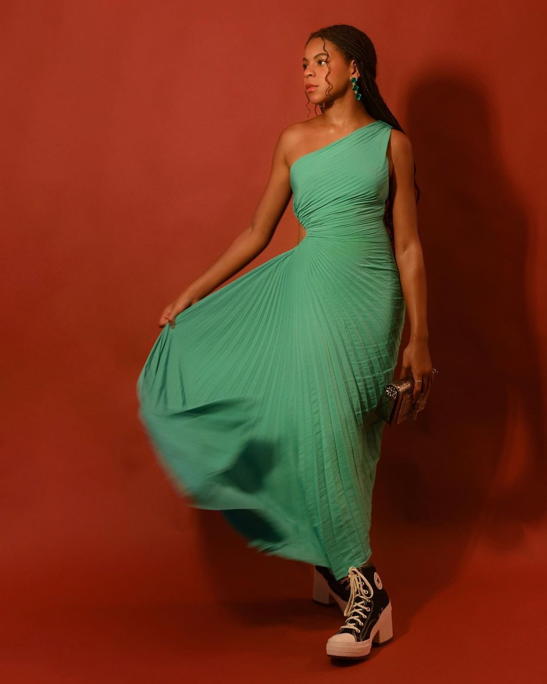 The Grammy award-winning pre-teenager accessorized with sapphire green earrings, a metallic clutch and black and white Converse platform heels.