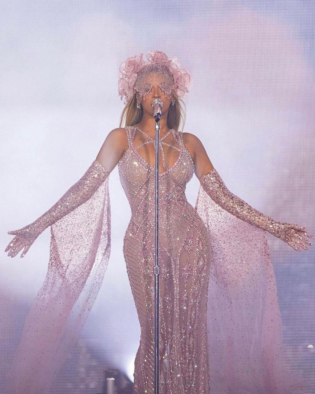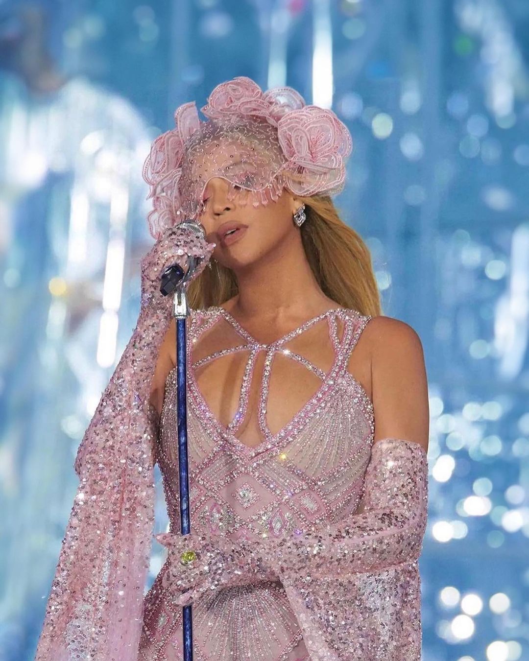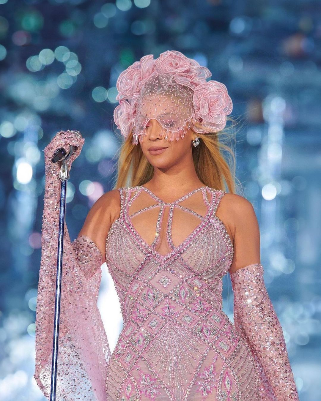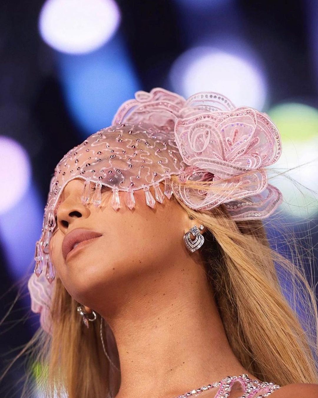 Wearing the color of the moment, B stepped out in a custom pink tulle dress embellished with captivating crystals and a sexy yet elegant cut-out neckline. She finished the look with stunning tulle gloves covered in sequins and a beaded headpiece adorned with outsized 3D embroidered flowers.