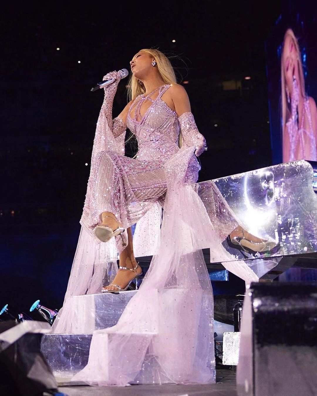 Working with stylists like her fav Kj Moody, Shiona Turni and British Vogue’s Fashion Director Julia Sarr-Jamois, Queen B has turned this concert tour into a fashion tour. While performing in East Rutherford the international songstress debuted another incredible performance look. Speaking to the trend of all pink everything during the year of OG It Girl Barbie, Bey lit up the stage in a dazzling rose Georges Hobeika gown.