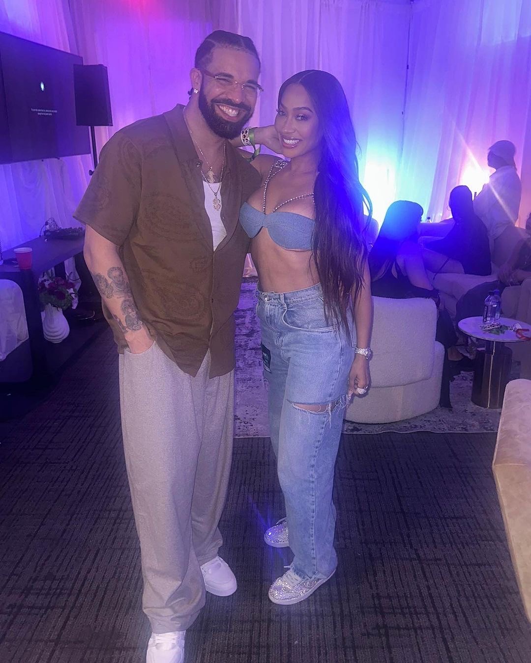 Drake who appeared to be cheesing from ear to ear, embraced the ‘Power’ actress who stunned in a denim on denim look including a $357 GCDS bralette upheld by a diamond chain, and paired with ripped straight jeans. Her footwear glistened with rhinestones as she shone brightly for the special gathering.