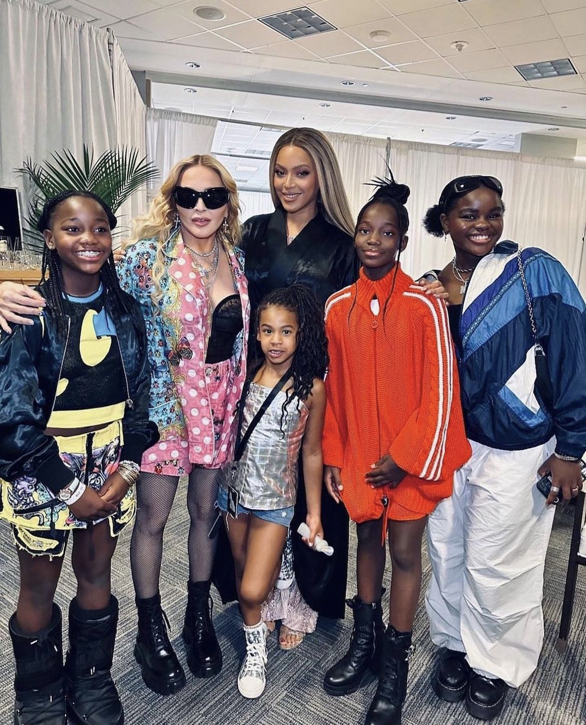 This time Madonna and Beyoncé had their children at their hip and were all smiles backstage at Beyoncé’s Renaissance tour in New Jersey. From Madonna’s gorgeous three girls, to Rumi Carter striking a pose in her kids Dior sneakers and resembling Blue Ivy and Solange, this was definitely a rare photo.