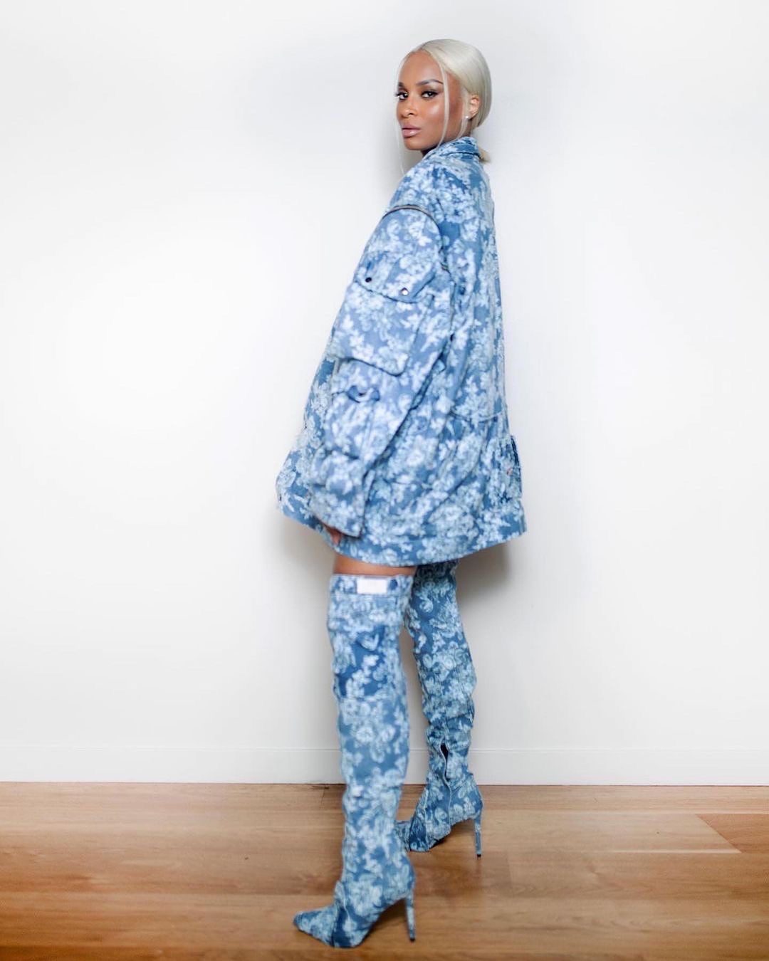 Using the Gap X LoveShackFancy floral denim print, Adusei designed an oversized biker denim jacket dress that had bold zipper pockets. He took his design one step further by creating custom denim stiletto boots using the same fabric with a 4-inches heel and round pointy-toe.