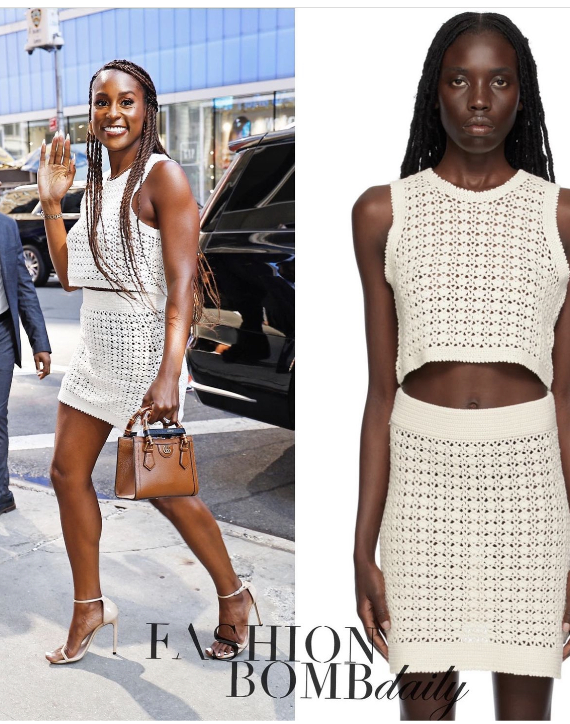 As ‘President Barbie’ was heading into GMA studios, she wore a $420 LESET Lucy tank top that she paired with the matching high-waisted crochet miniskirt. Opting for monochromatic, she accessorized with nude patent leather Stuart Weizman open-toe heels.