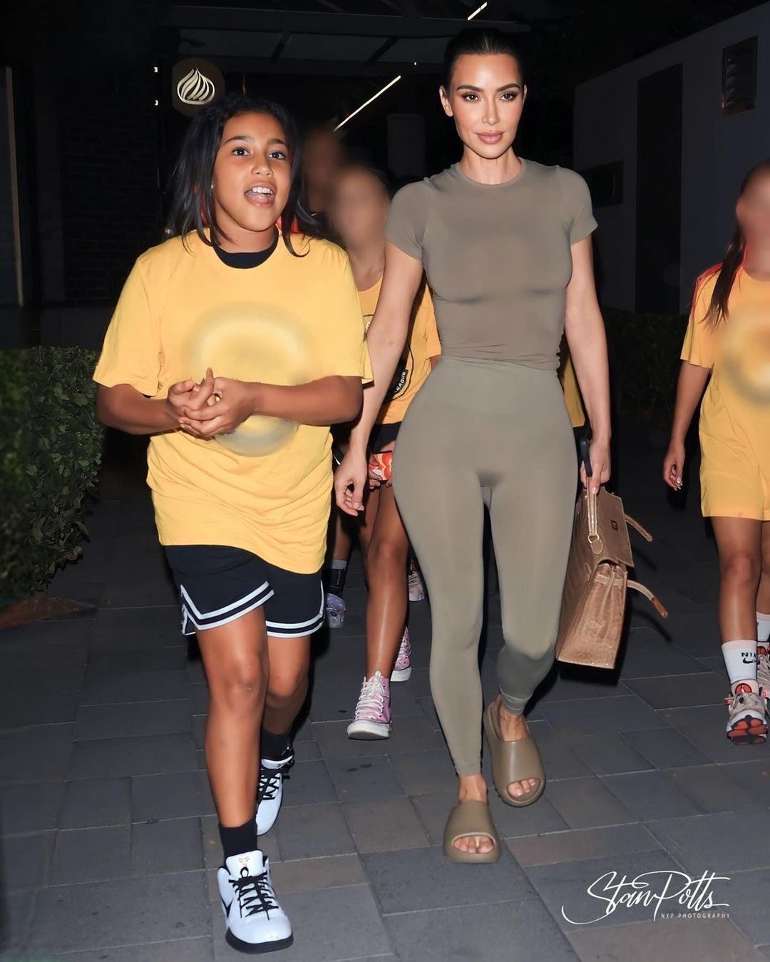 Kim Kardashian attended North West’s basketball game over the weekend and chose the comfy chic route in an army green Skims top paired with leggings, and Yeezy slides.