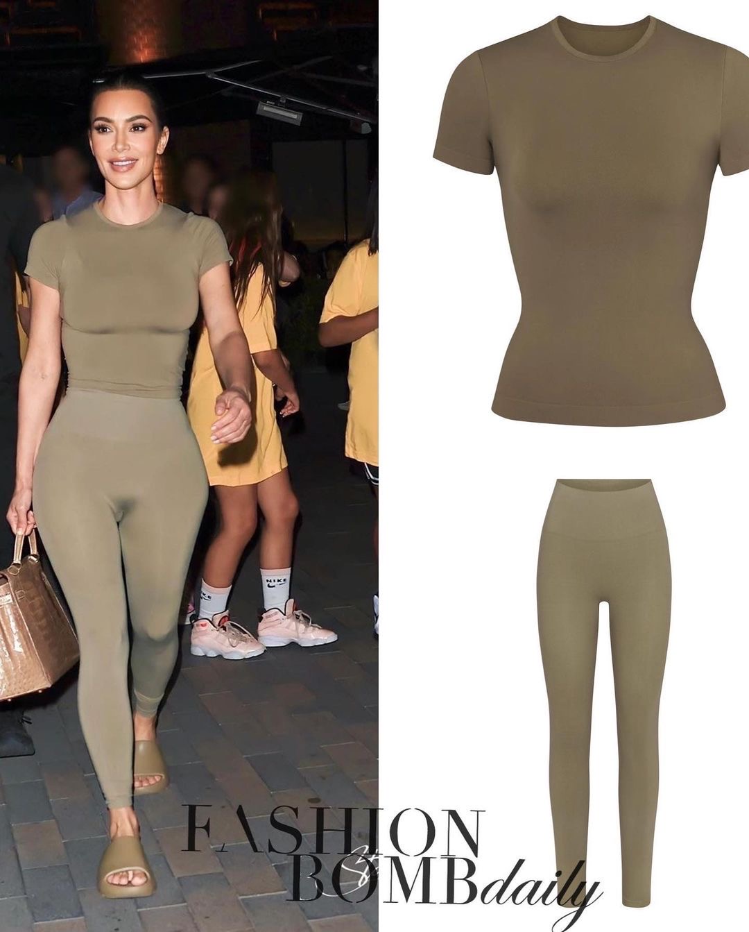 Perhaps Kanye West had some influence with the color schemes of Skims apparel as the color of her slides looked parallel with her muted tone monochromatic outfit.