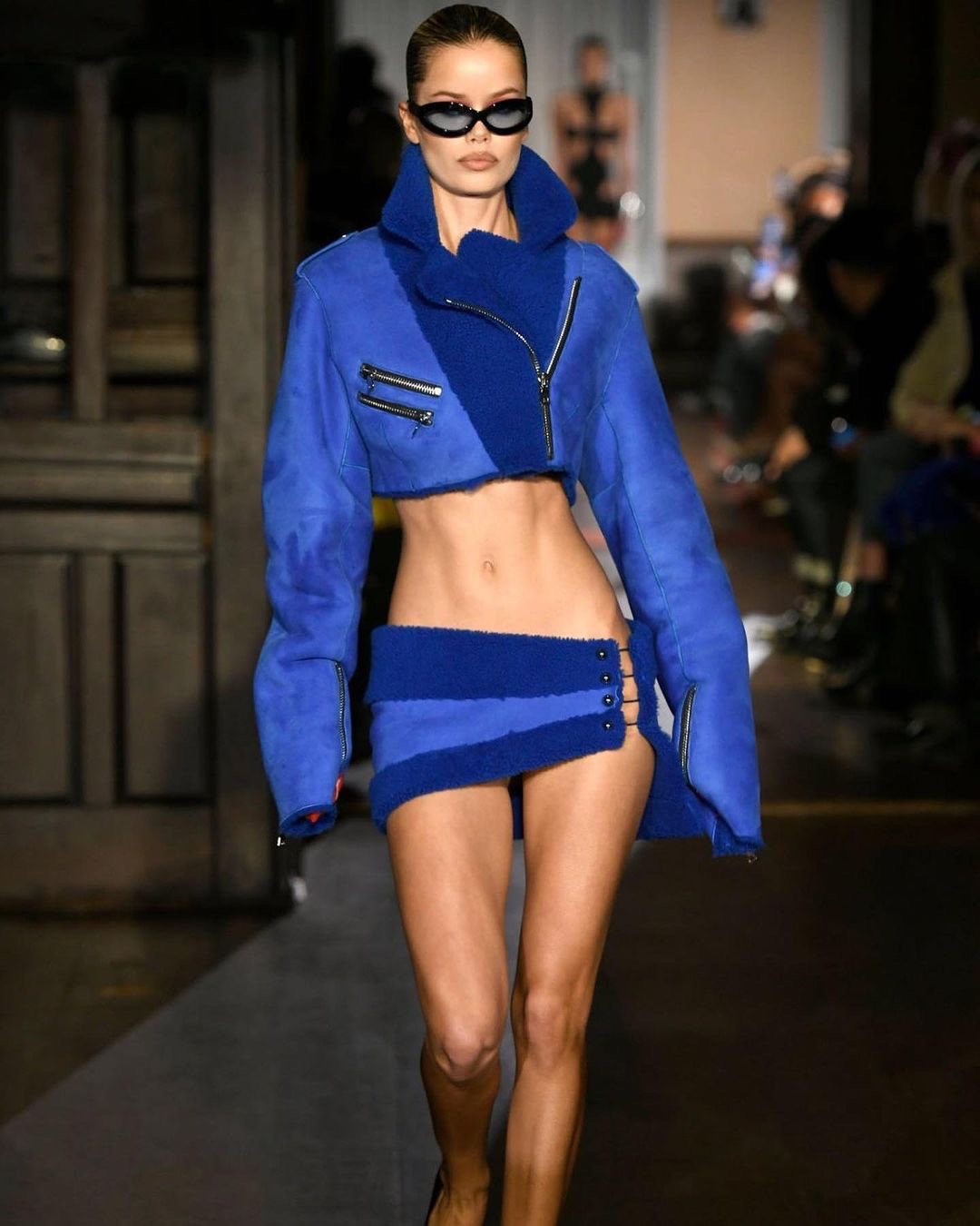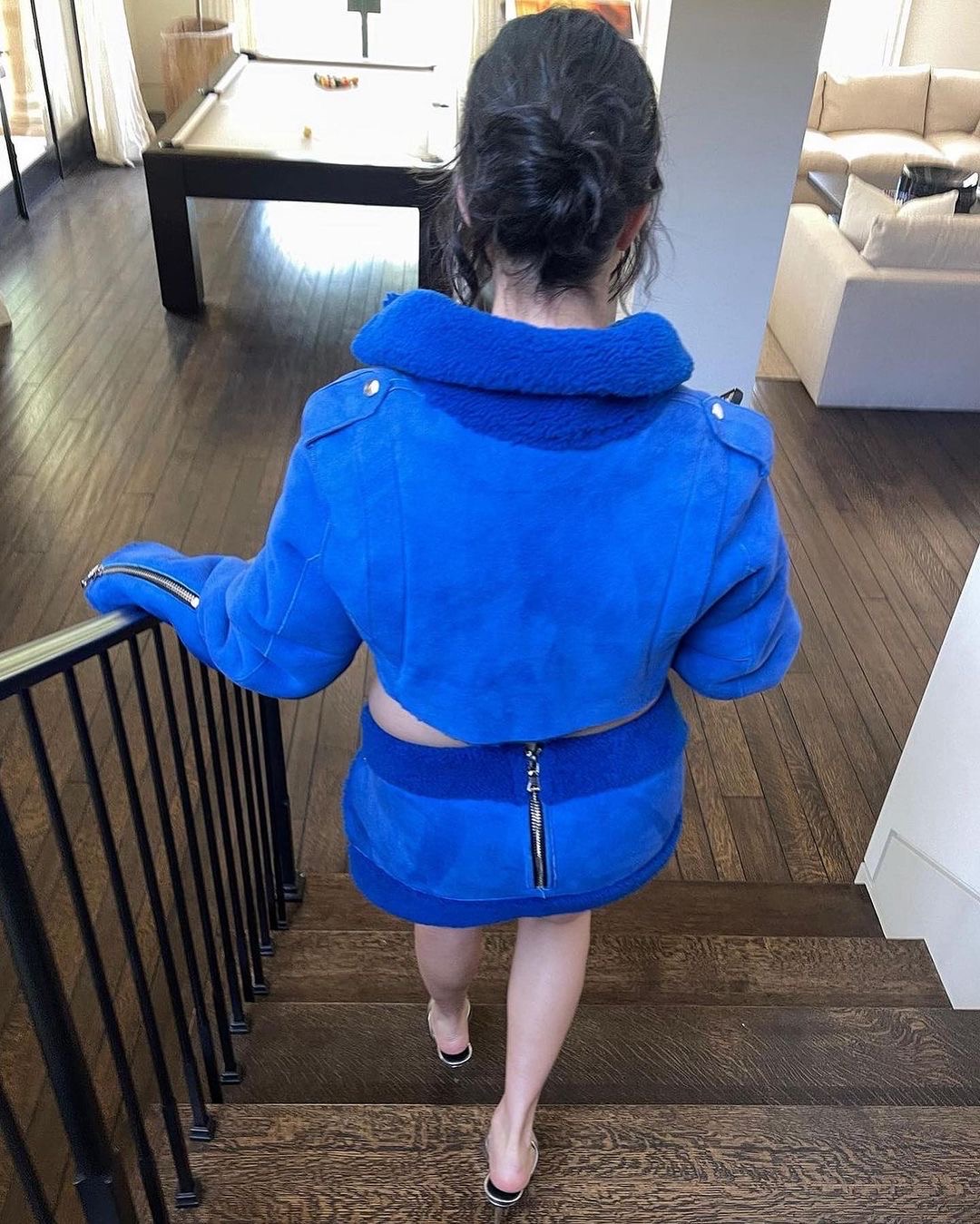 Staying on trend with her new found style, Kourtney posed in a $5228 cobalt blue LaQuan Smith cropped leather biker jacket with shearling trim from LaQuan’s FW 22/23 collection.