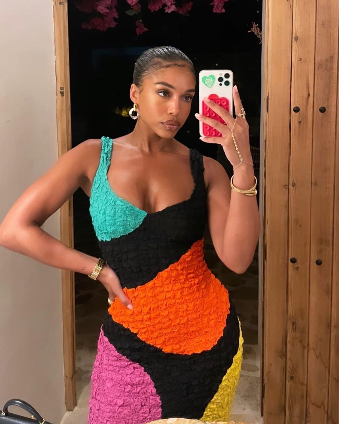 Opting for gold jewelry including Cartier’s gold Love, with a gold ring and earrings, Lori looked refined and elegant. Her yellow and black color-block Loewe petal sandals accentuated her ensemble and perhaps elevated it one step further.