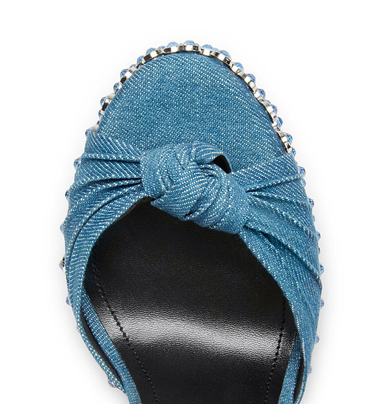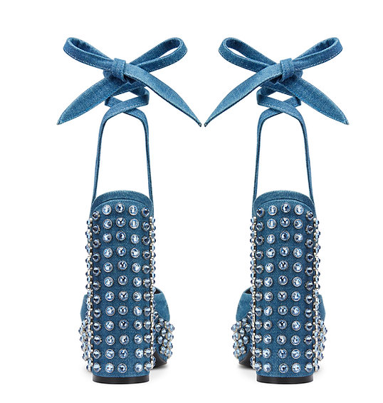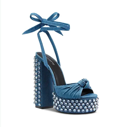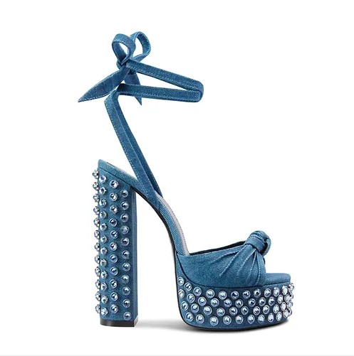 Introducing the Don by Voyetté Lee. The denim-coated, nearly 6-inch platform sandal with a leather insole and blue crystal embellishment. Bombshells and Bombers, this is not a shoe for the weak. It speaks to the never-ending denim trend with a bit of pizzaz so you can take this pretty platform from brunch with the girls to date night with your beau.