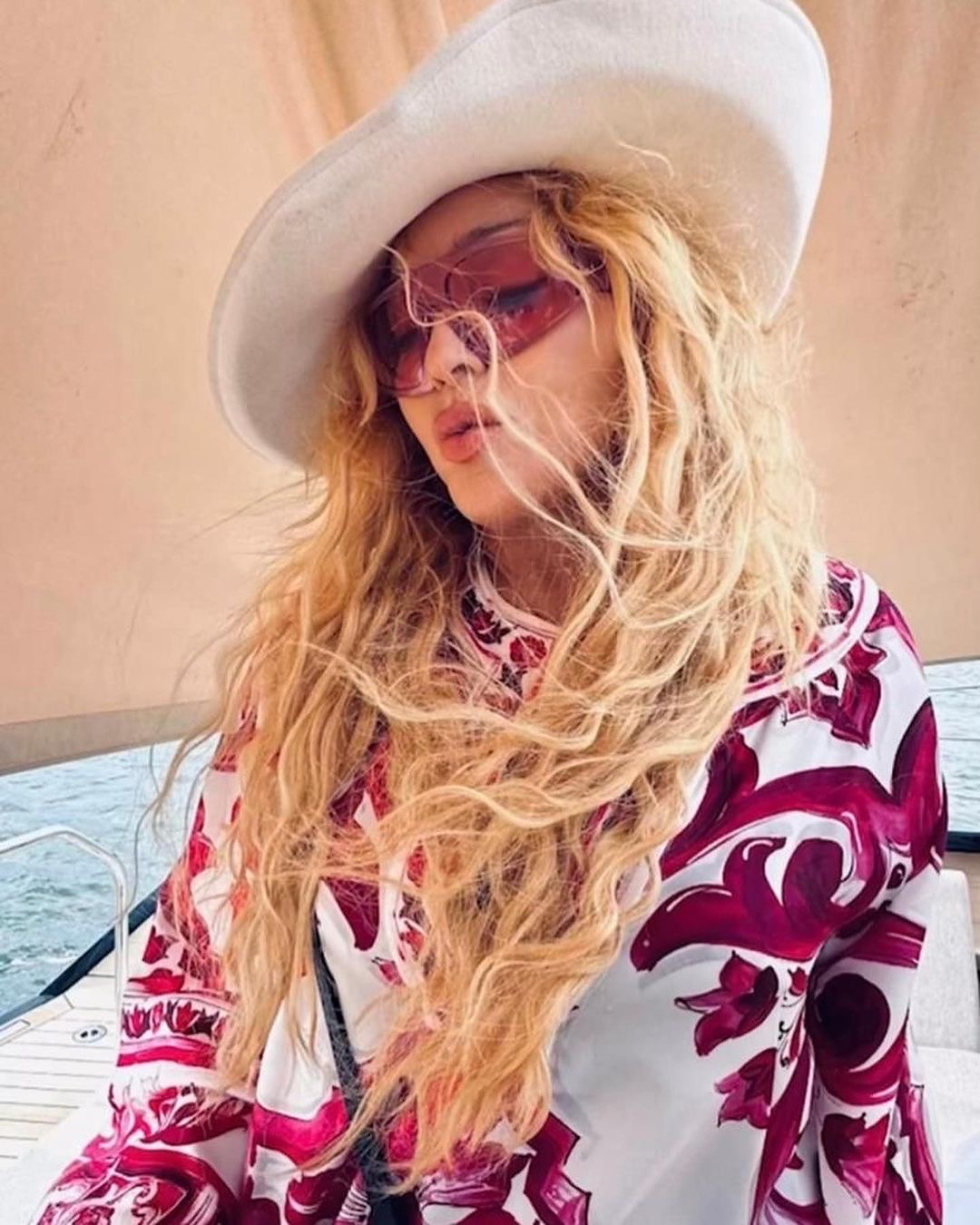 Sporting the same exact Dolce & Gabbana majolica- print as her twin girls while on a sail boat at sea, Madonna looked incredible and at peace with fuchsia shades that perfectly framed her face.