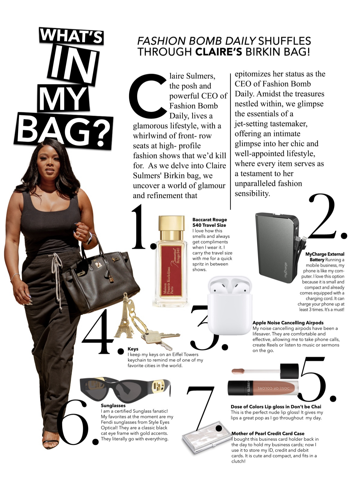 Solidifying the magazine concept, you can also revel in Claire’s lifestyle by reading about what’s in her Hermes Birkin bag, which is always a favorite component of any magazine.