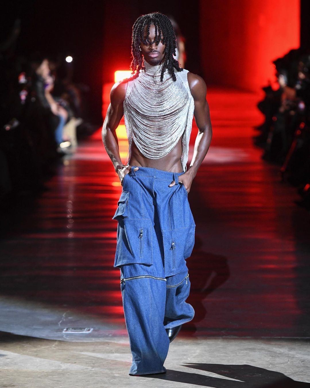 Not to mention his high-neck crystal chain tops that we saw on both women and men models that we can easily see on Lori Harvey and Kelly Rowland.
