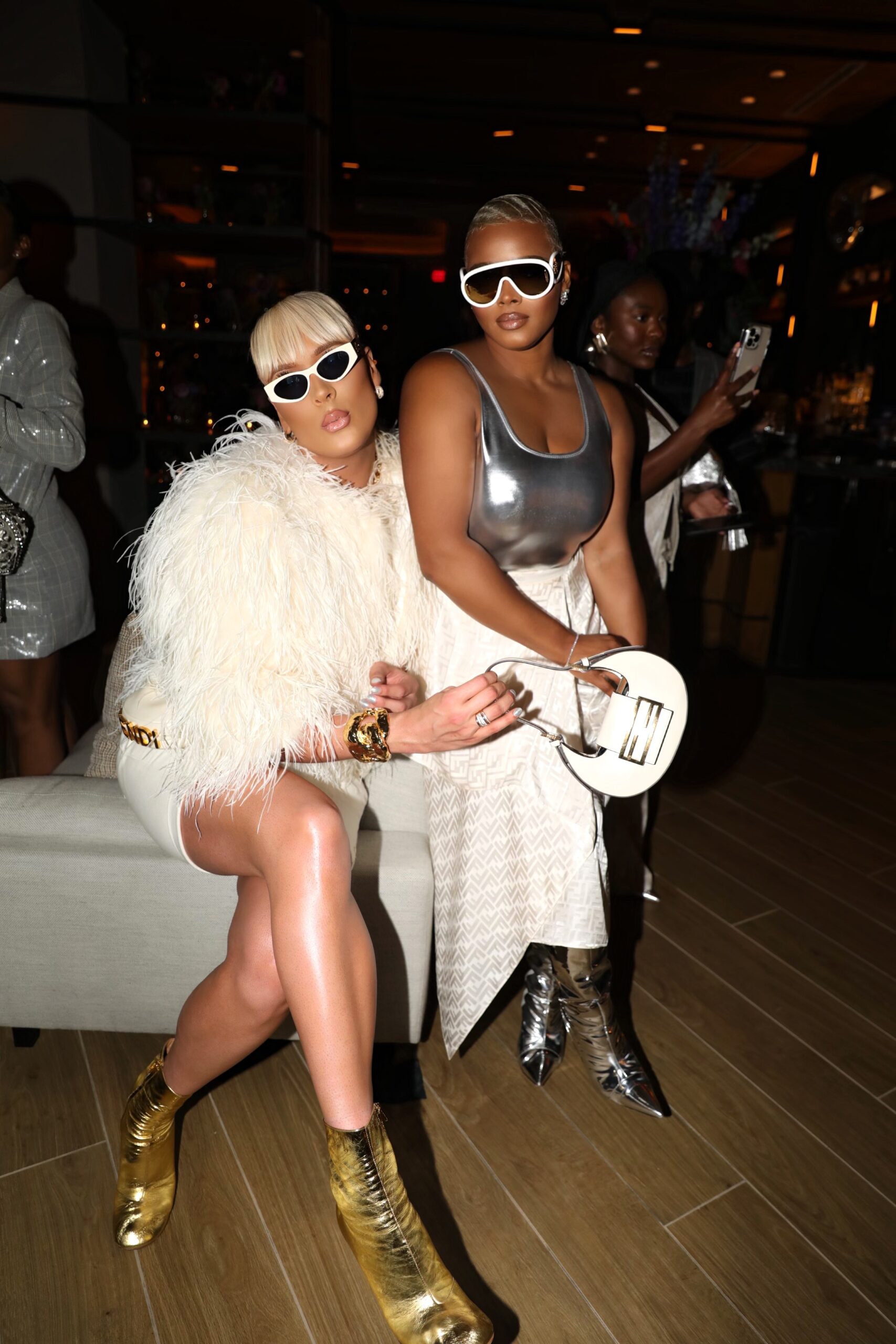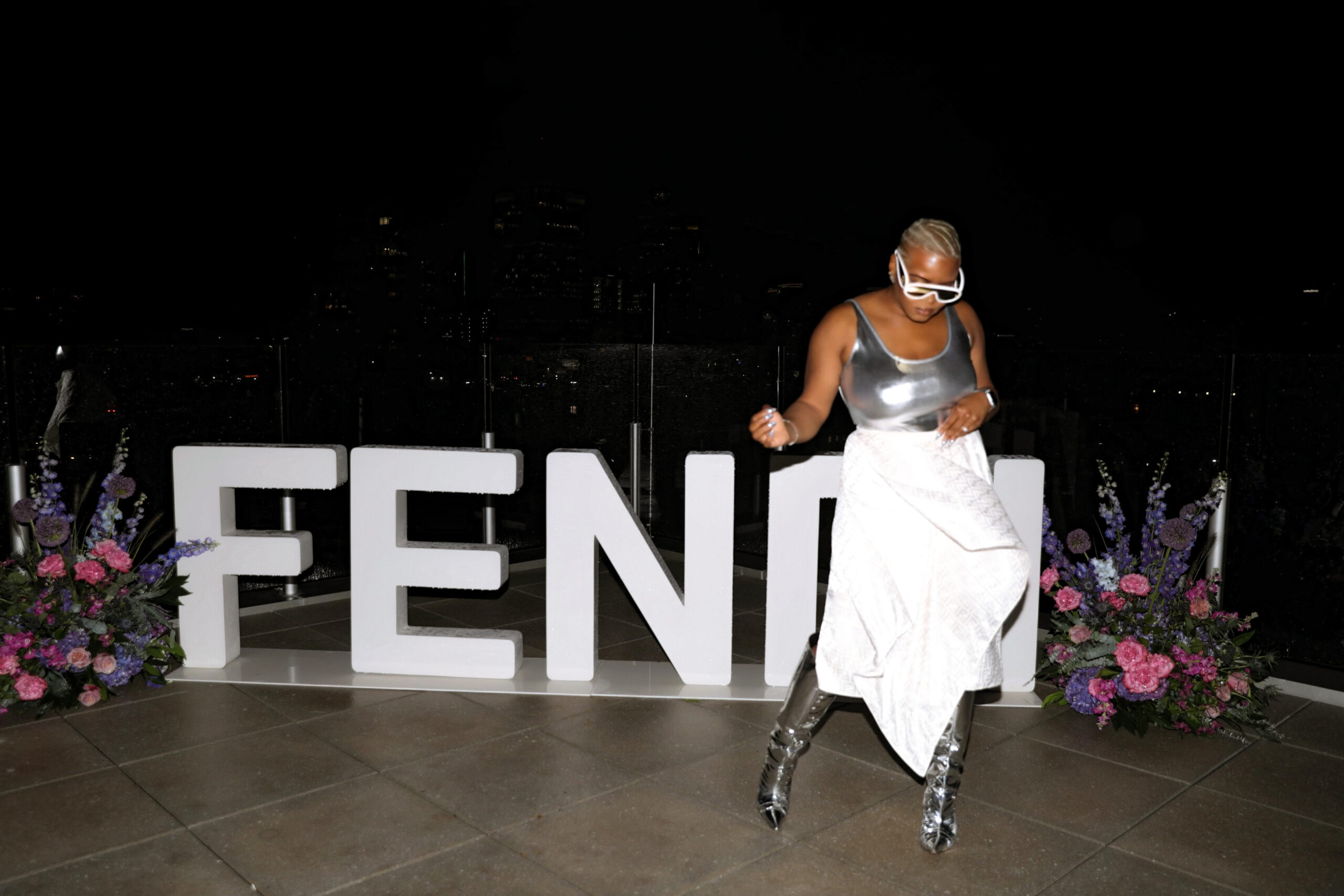 Of course Fashion Bomb CEO, Claire Sulmers made a luxe arrival in her Loewe mirrored shades, and silk FENDI skirt, that she paired with bold silver metallics to compliment her chrome stiletto nails.