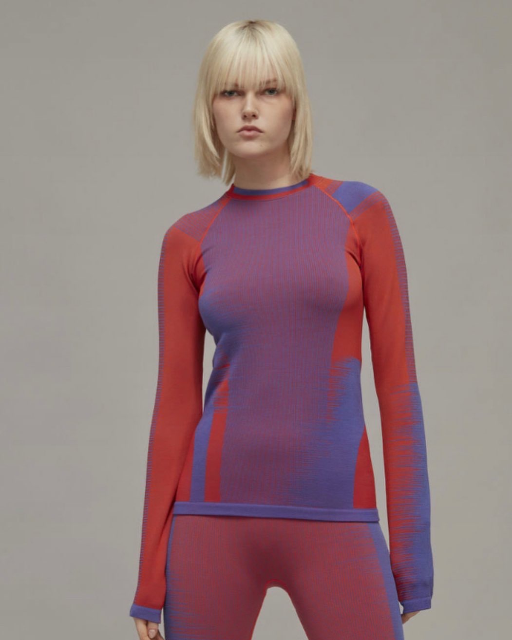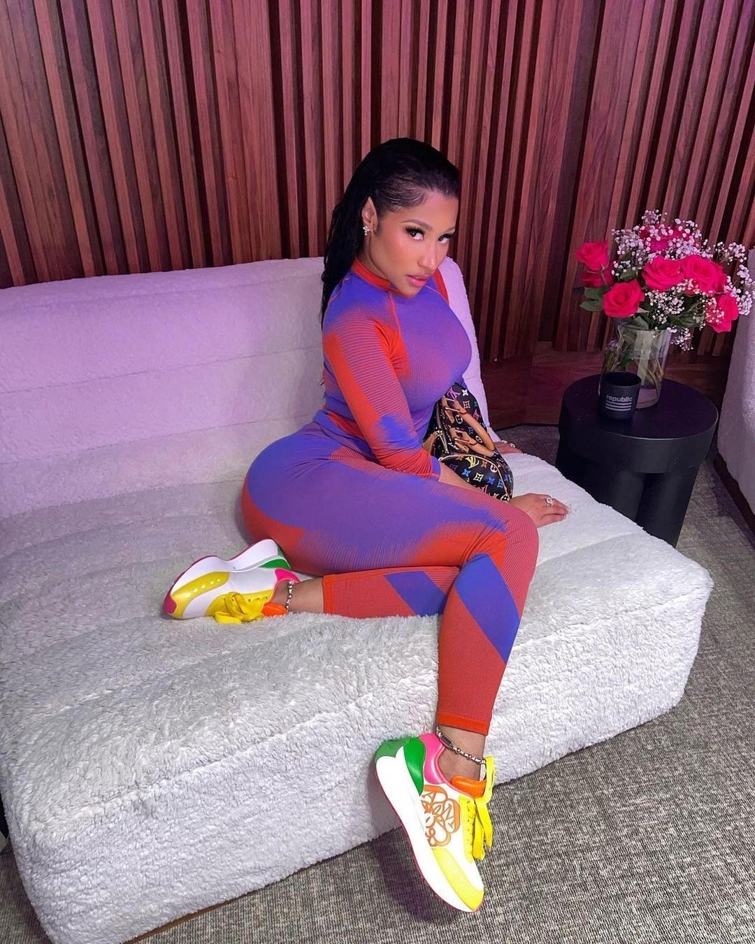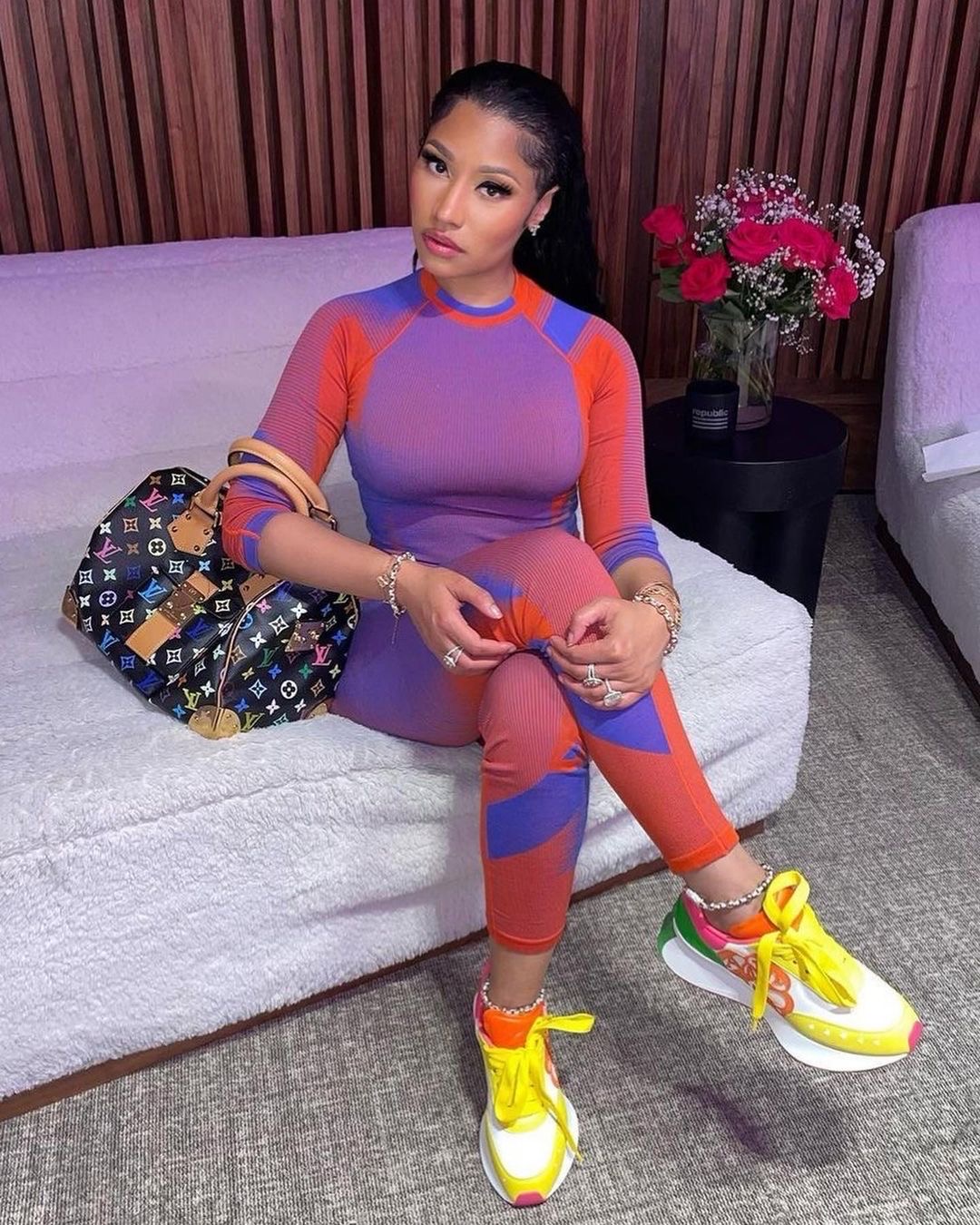 While sitting pretty and looking fresh to death, Nicki wore a semi-solar red and dark purple Y-3 set including a $274 color block engineered knit long sleeve tee and the matching $76 knit tights.